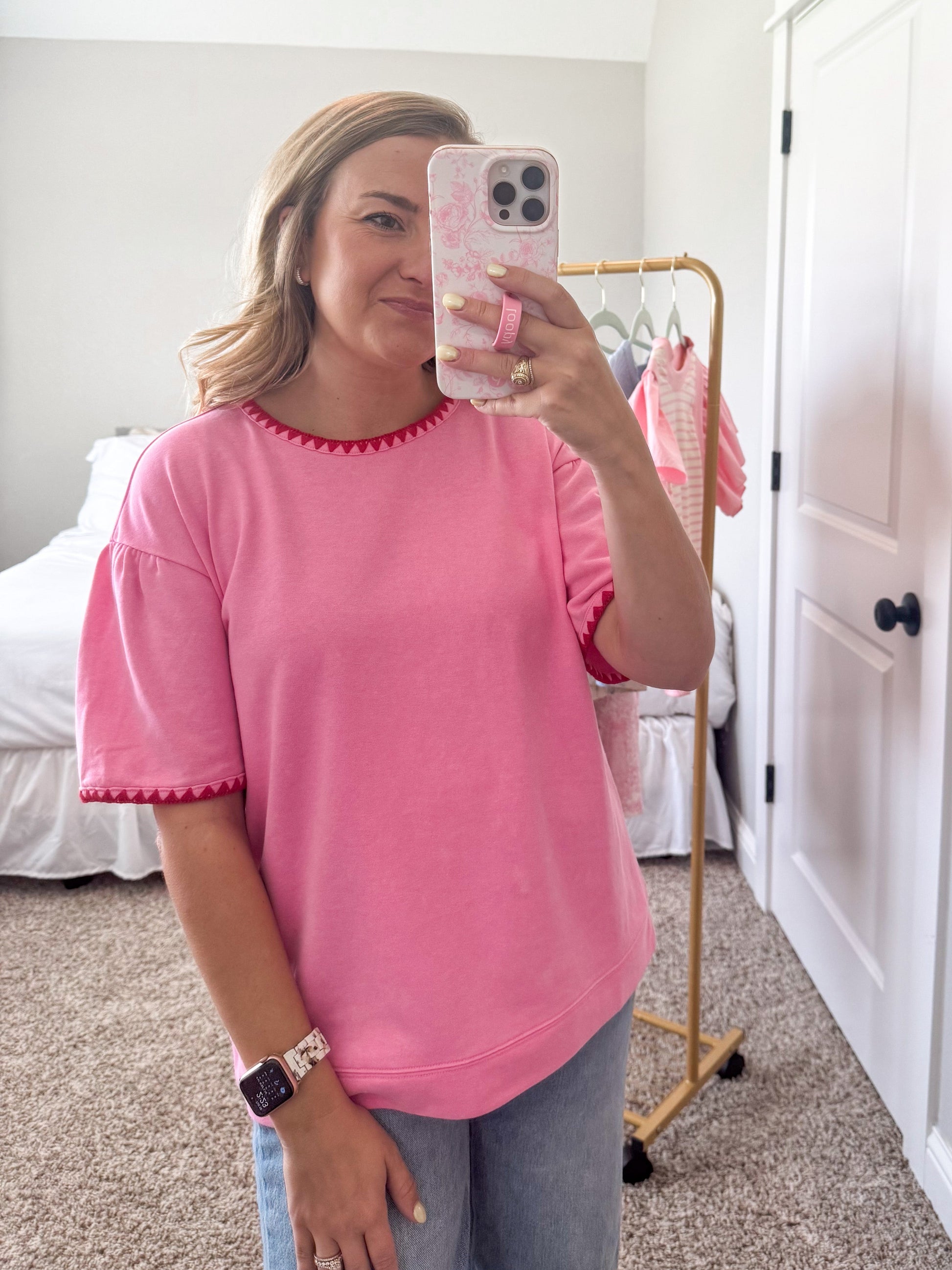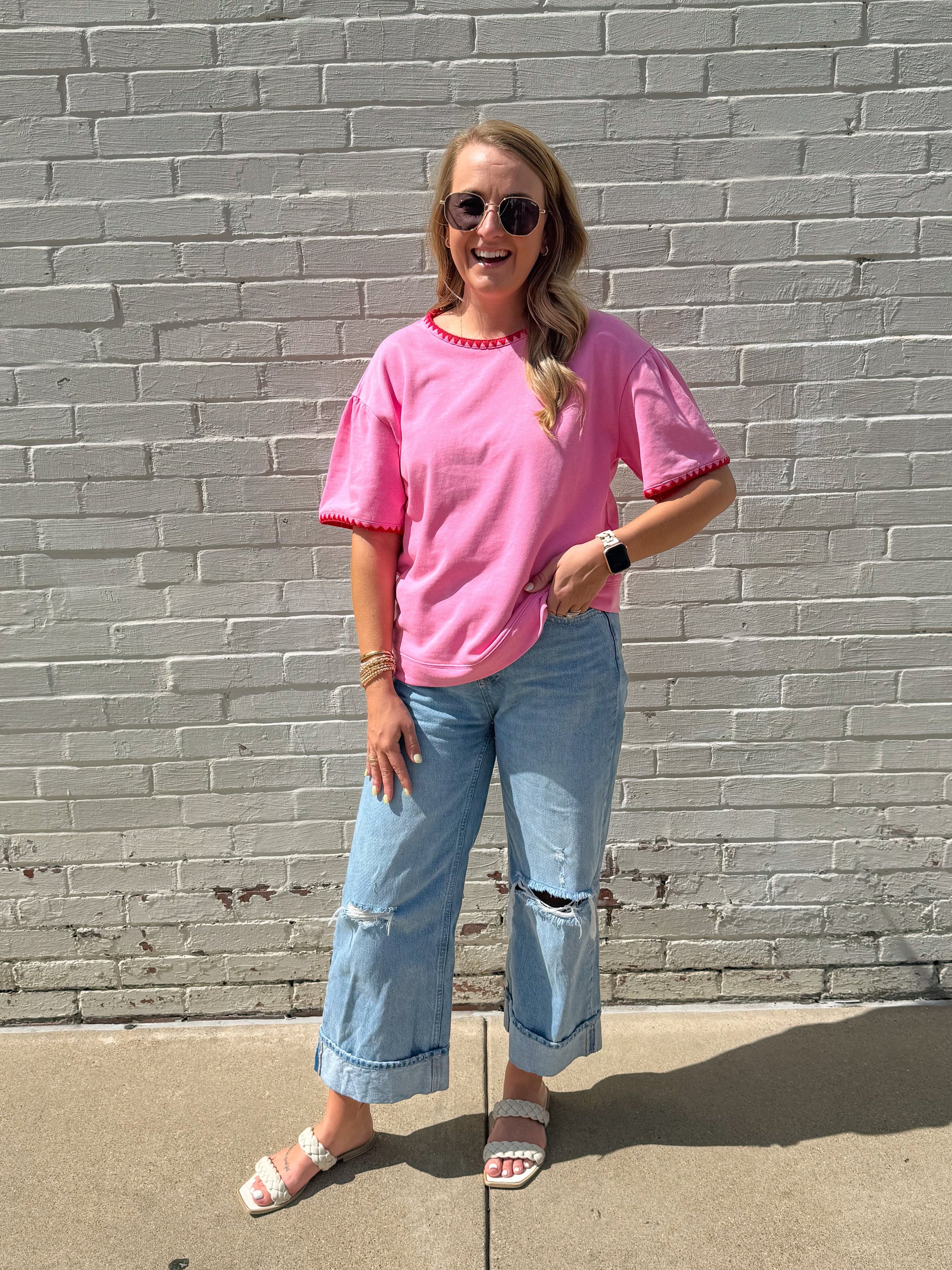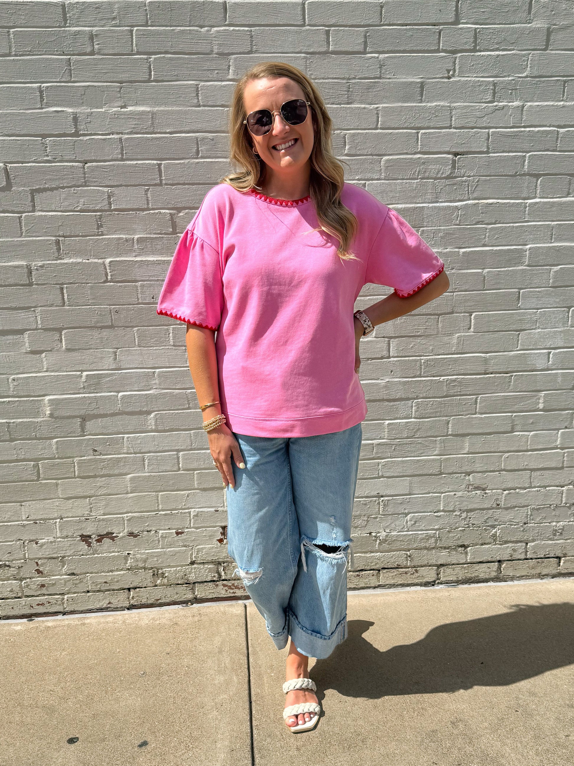 Comfy meets cute in the Abigail Top! This relaxed-fit tee comes in a washed pink with bold red trim at the collar and sleeves for a fun, sporty twist. Made from a lightweight fabric so it’s perfect for those days when you want to look effortlessly put-together without sacrificing comfort.