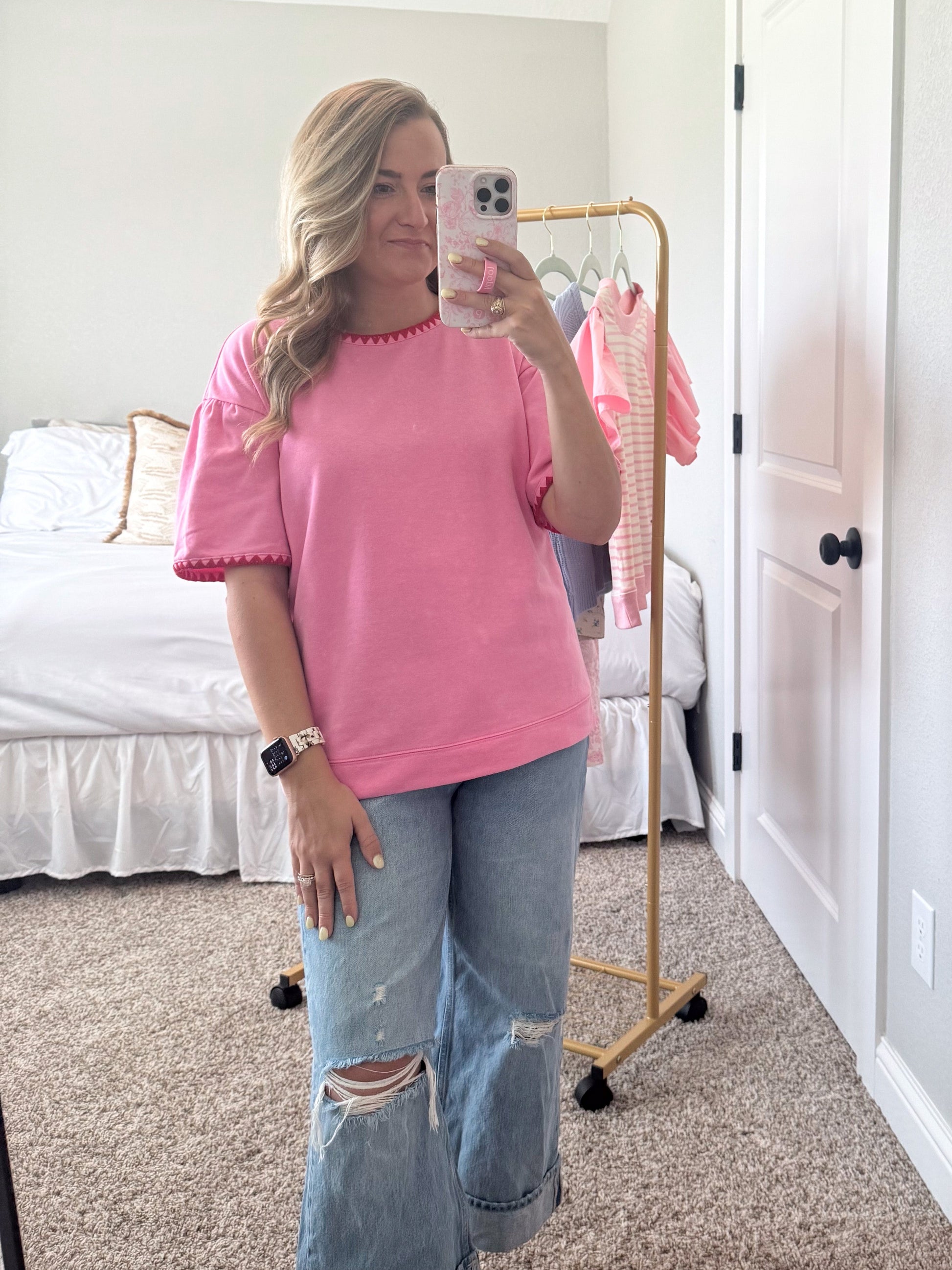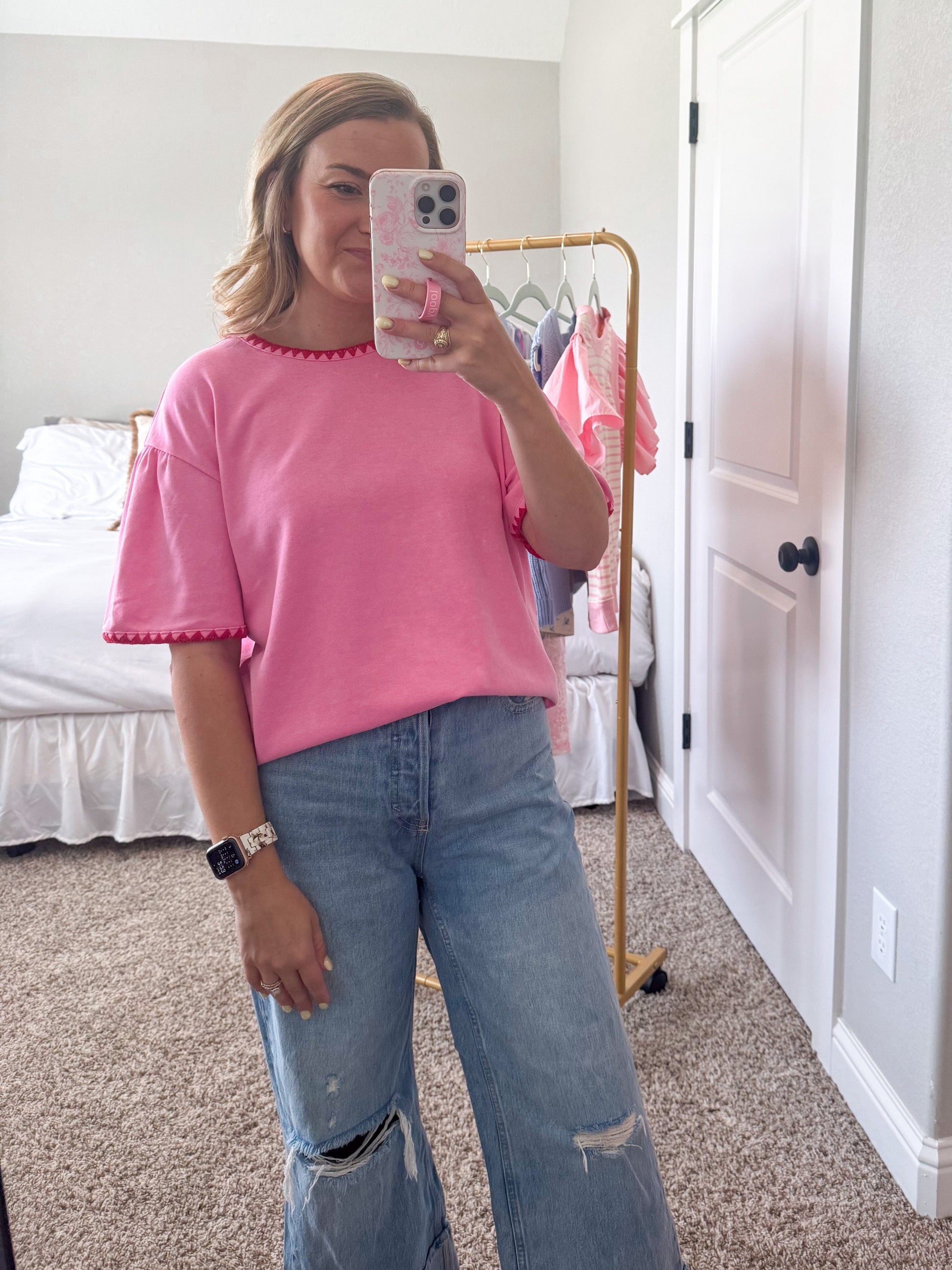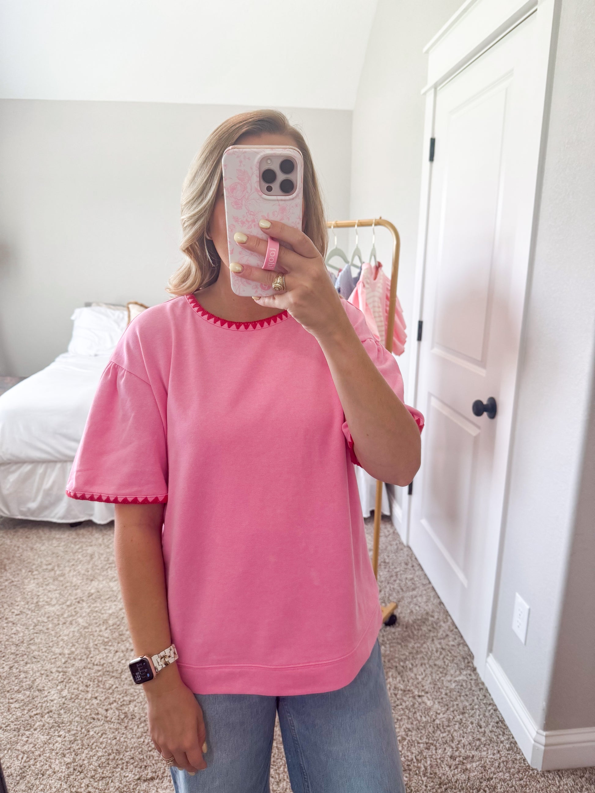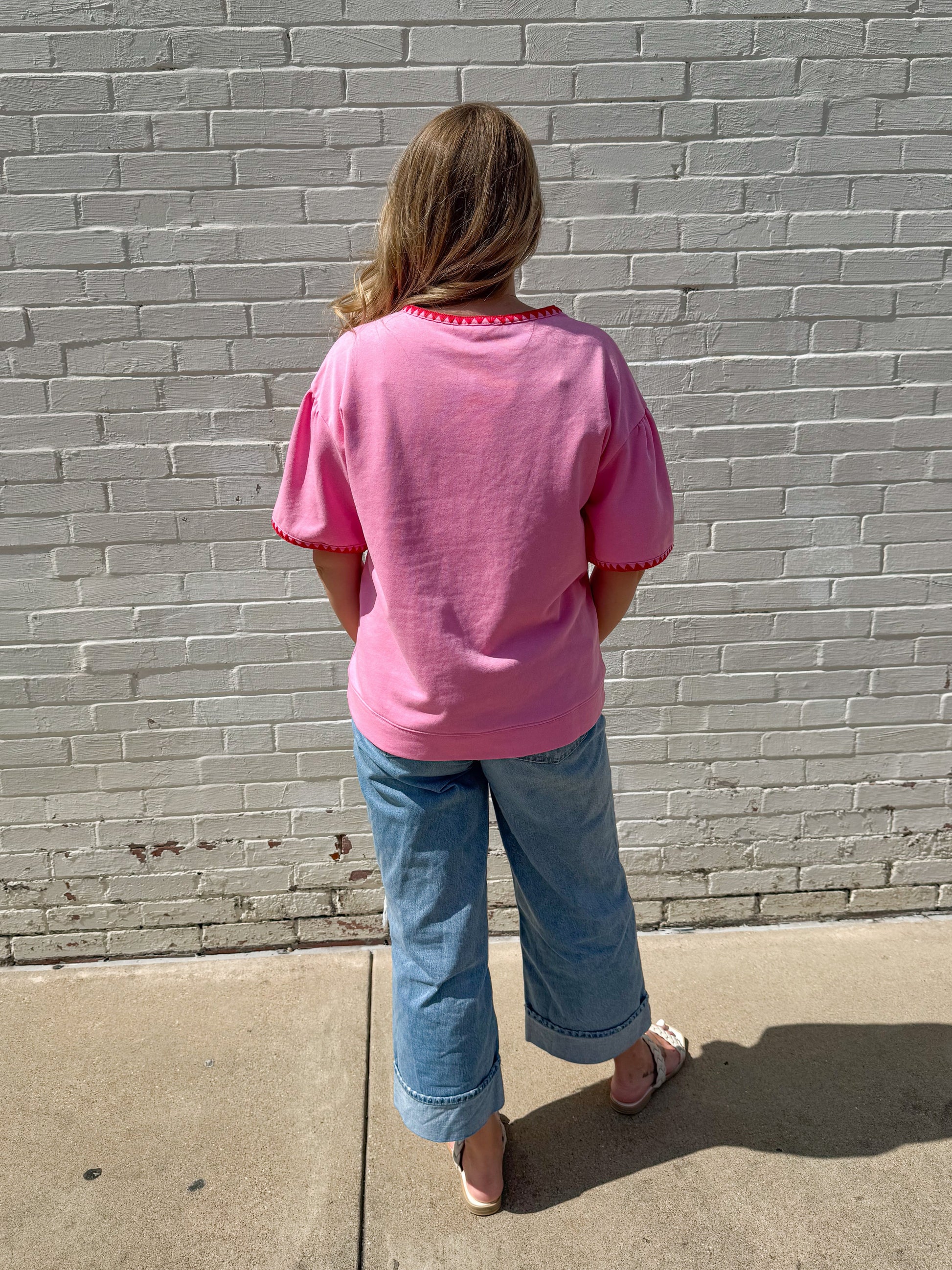 Comfy meets cute in the Abigail Top! This relaxed-fit tee comes in a washed pink with bold red trim at the collar and sleeves for a fun, sporty twist. Made from a lightweight fabric so it’s perfect for those days when you want to look effortlessly put-together without sacrificing comfort.