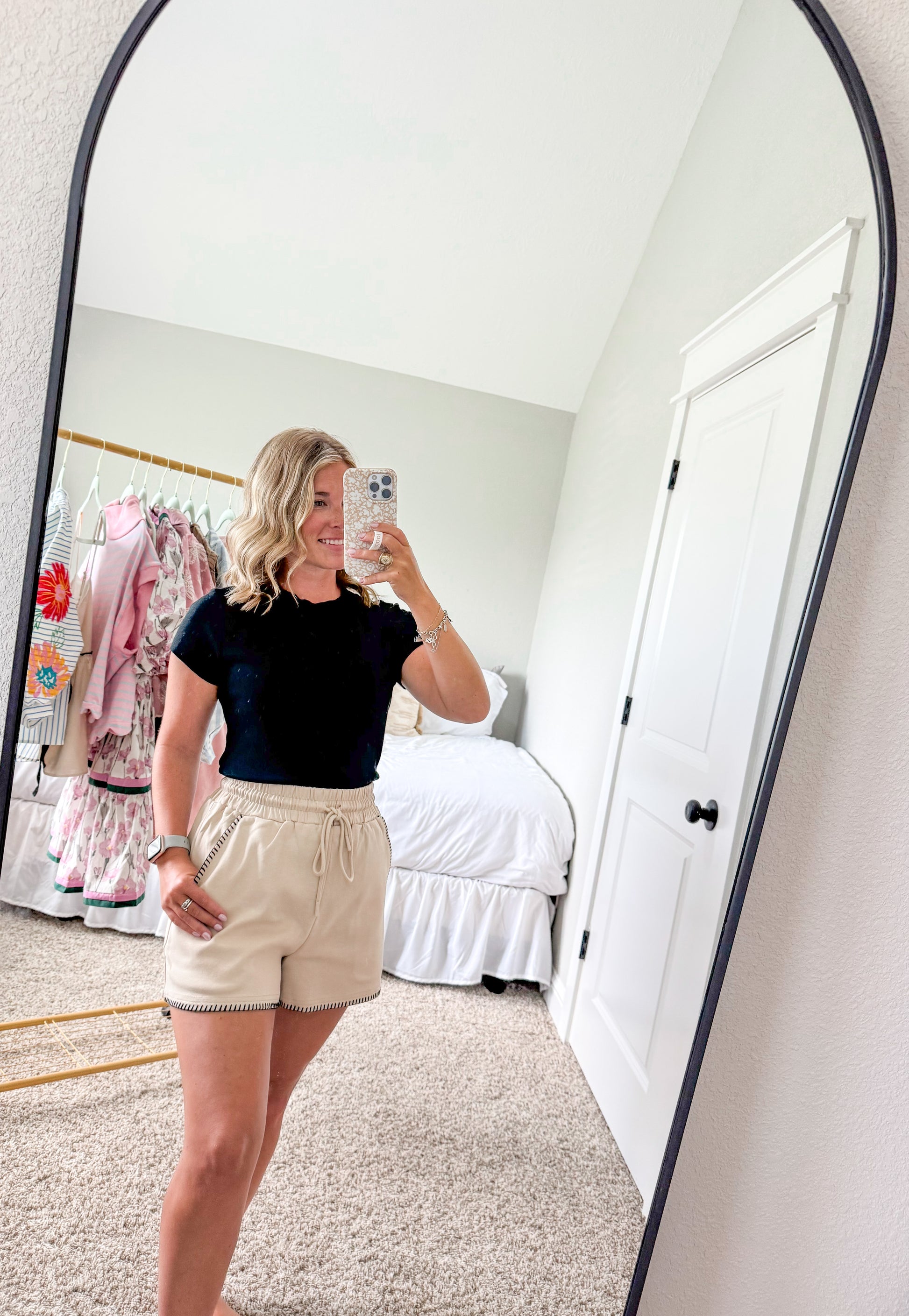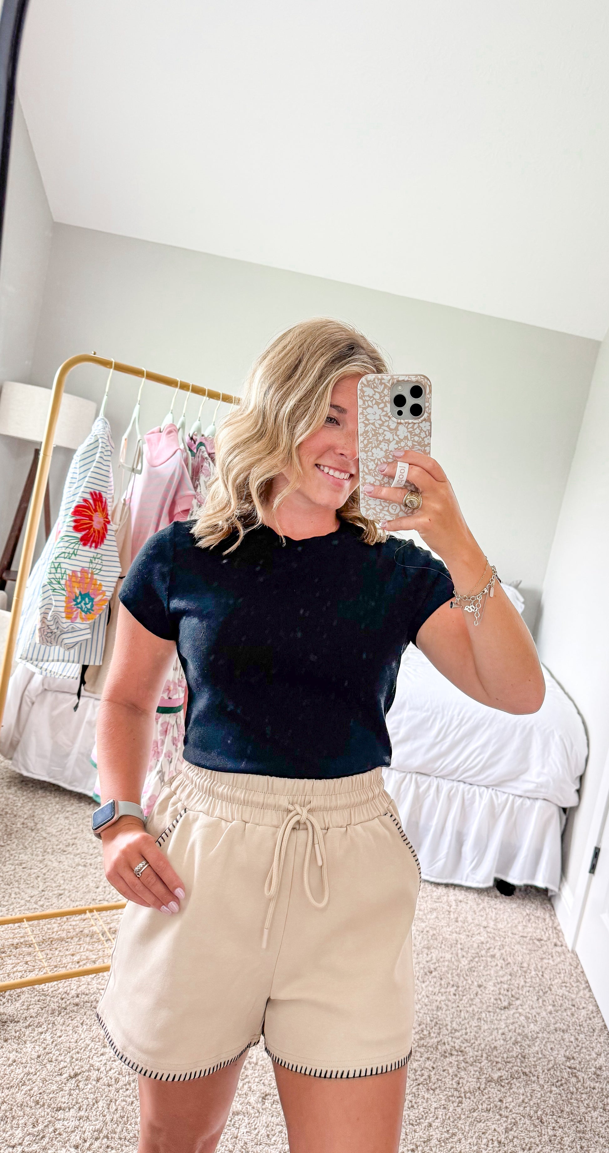 Skip into style with our Alex Stitched Shorts! These high-waisted cuties feature convenient side pockets and an adjustable tie at the elastic waistband. The playful contrast stitching adds just the right pop of personality! Crafted from lightweight, non-sheer knit fabric that keeps you comfy all day long. Perfect for adventures big and small! Mix and match with tanks, sweaters, or your favorite tee for a look that's as versatile as your busy schedule!