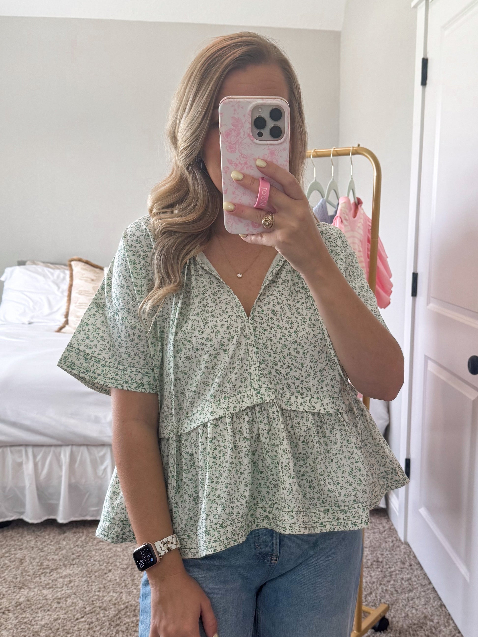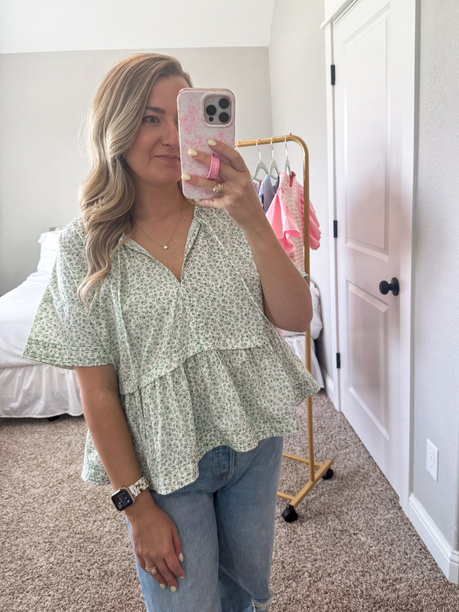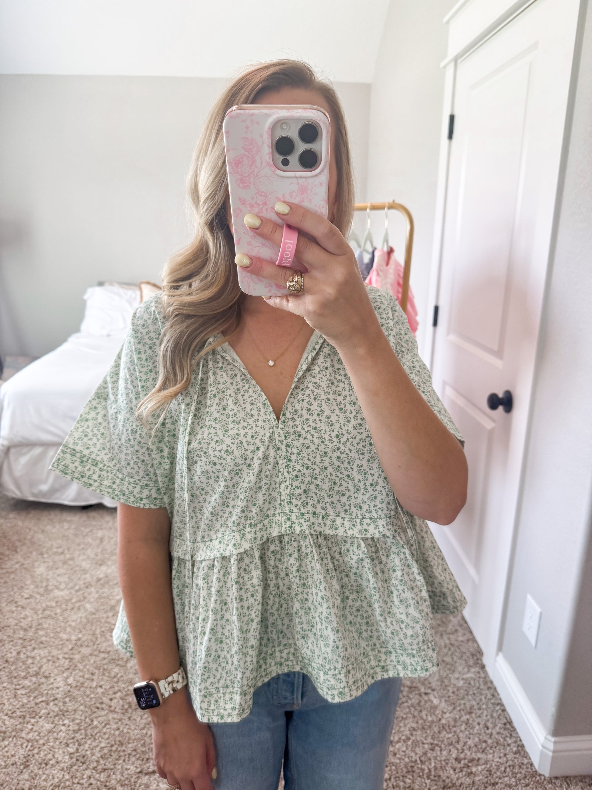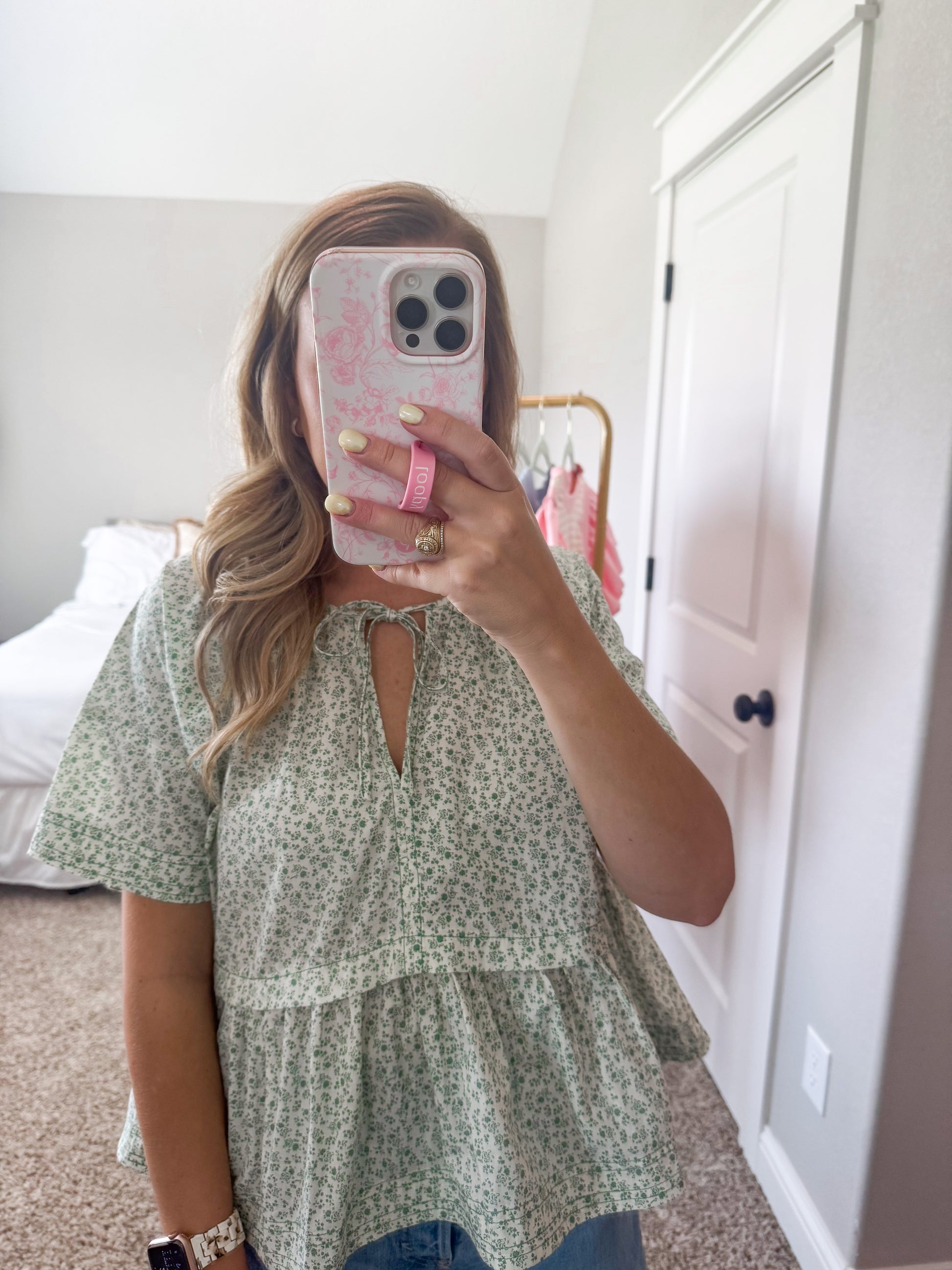 Sweet, simple, and effortlessly feminine—the Brittany Top is your new warm-weather favorite. This lightweight blouse features a sage green floral print on a creamy backdrop, with a breezy tiered silhouette that flatters all figures. A dainty front tie at the neckline adds a charming touch, while the short sleeves and flowy hemline keep it casual and cool. Perfect for pairing with denim, skirts, or your favorite cutoffs for an easy, everyday look!