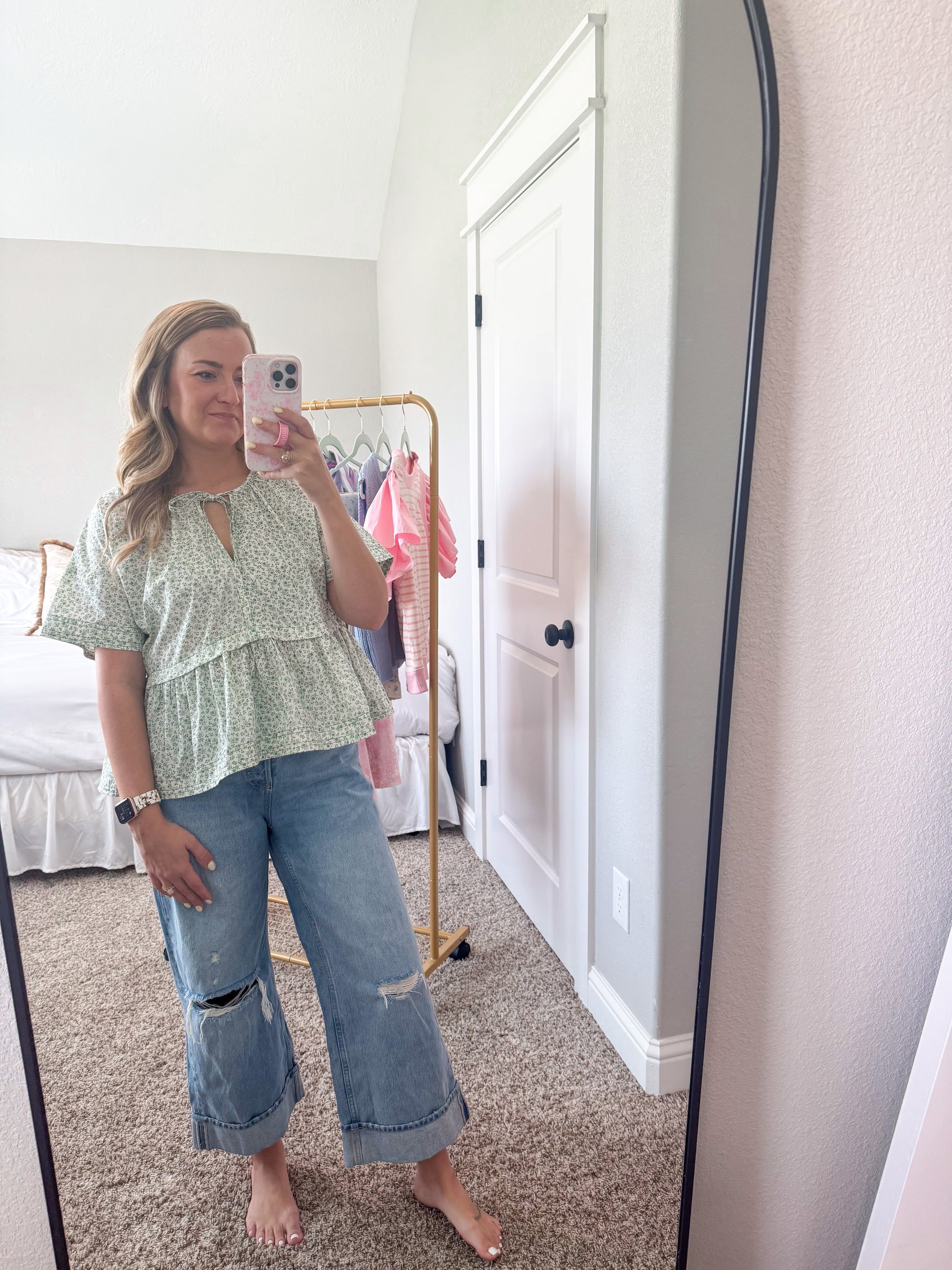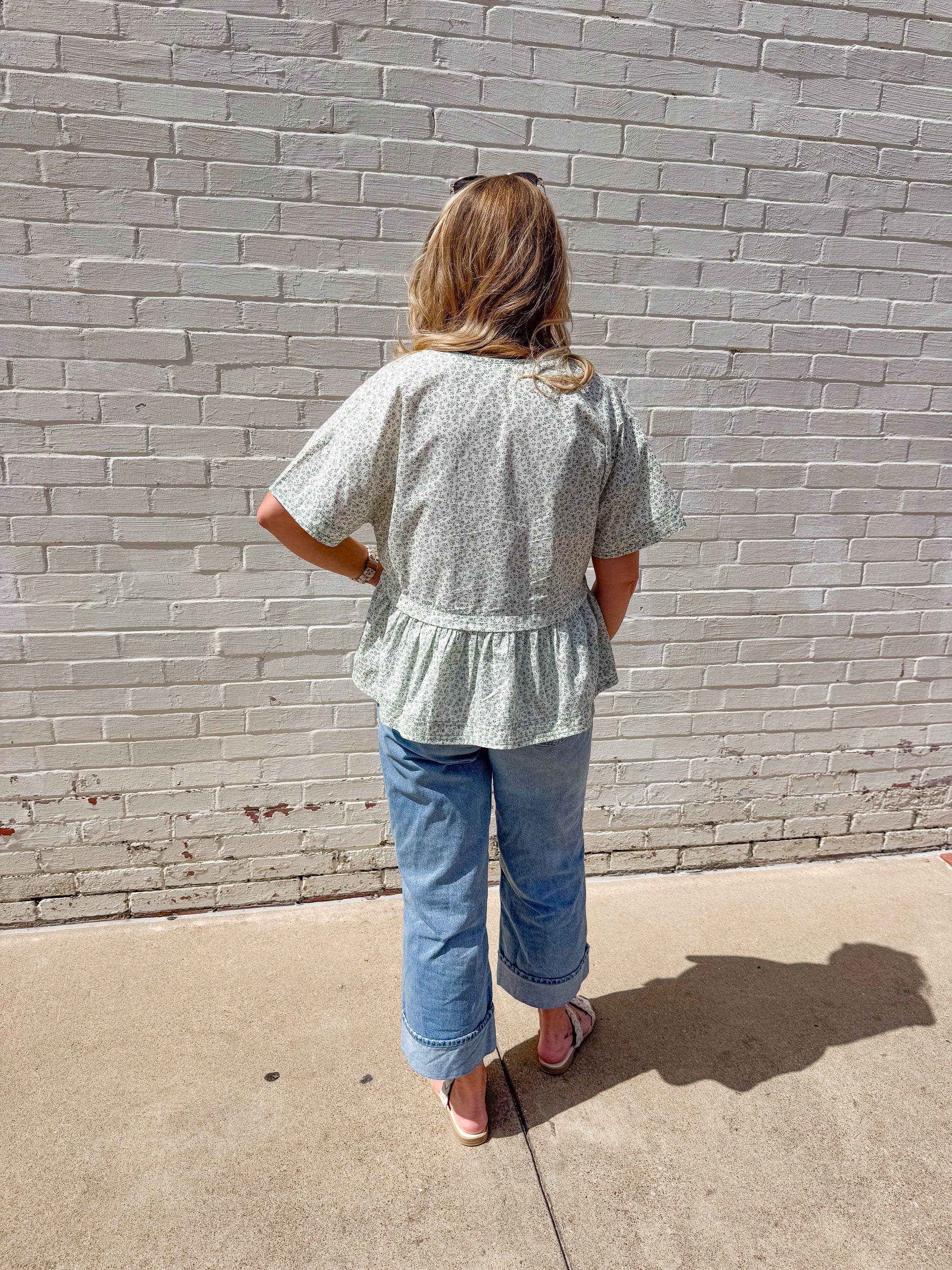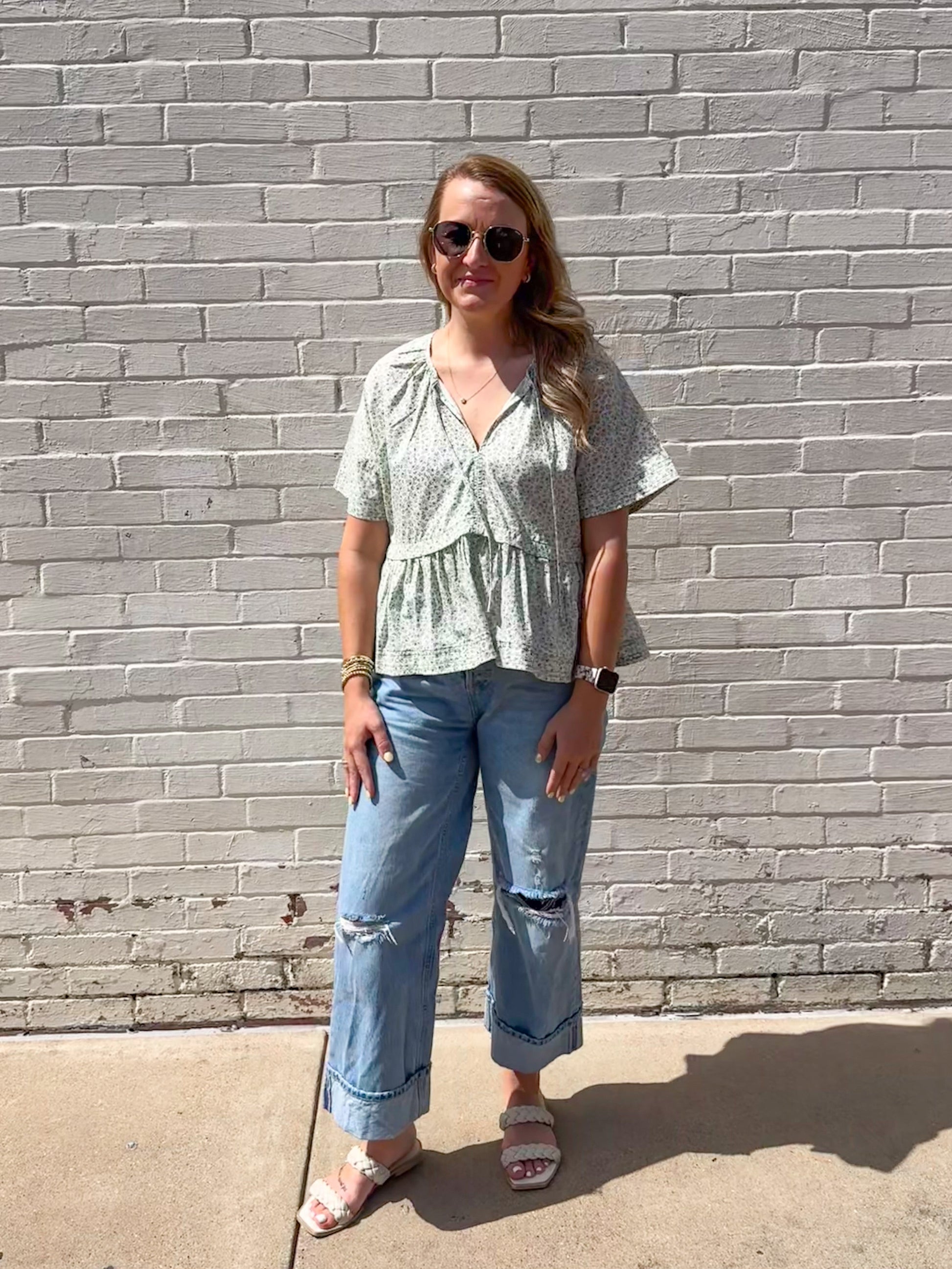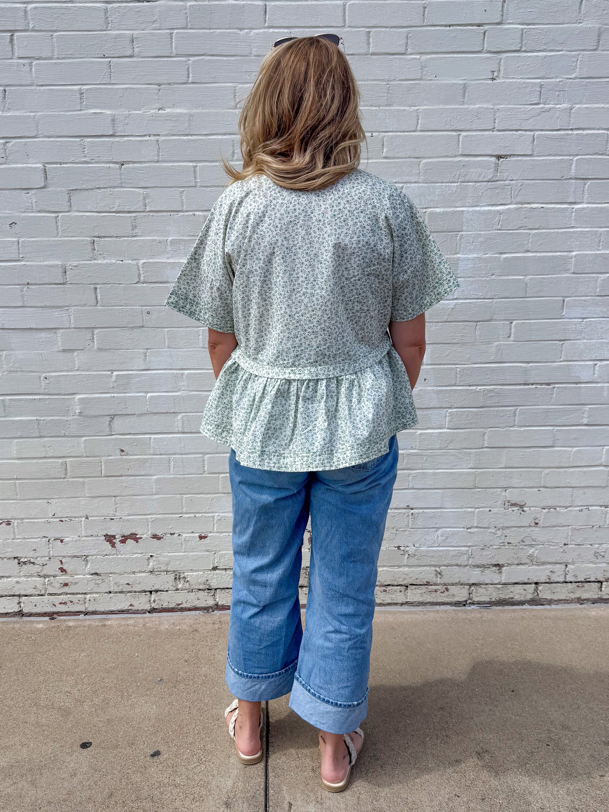 Sweet, simple, and effortlessly feminine—the Brittany Top is your new warm-weather favorite. This lightweight blouse features a sage green floral print on a creamy backdrop, with a breezy tiered silhouette that flatters all figures. A dainty front tie at the neckline adds a charming touch, while the short sleeves and flowy hemline keep it casual and cool. Perfect for pairing with denim, skirts, or your favorite cutoffs for an easy, everyday look!