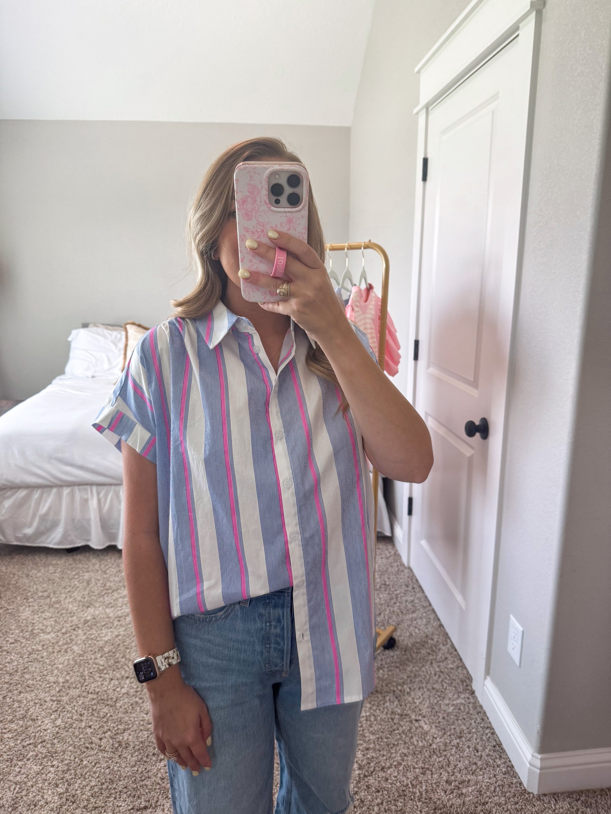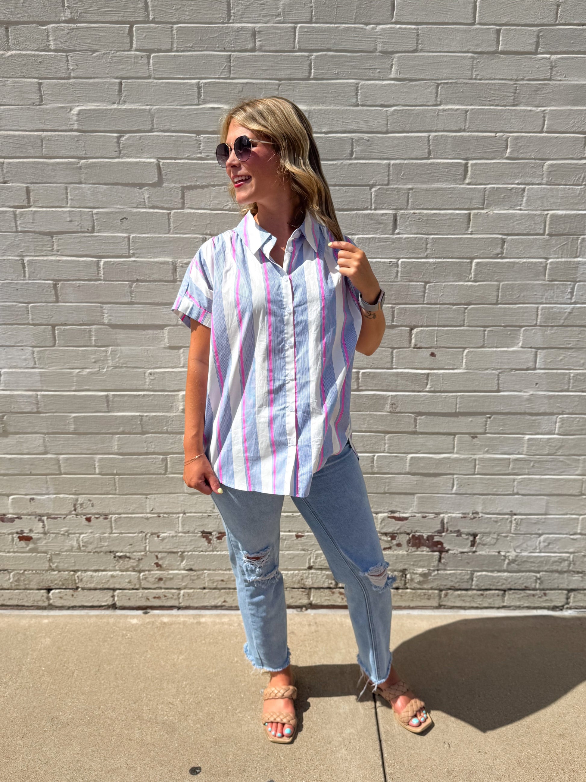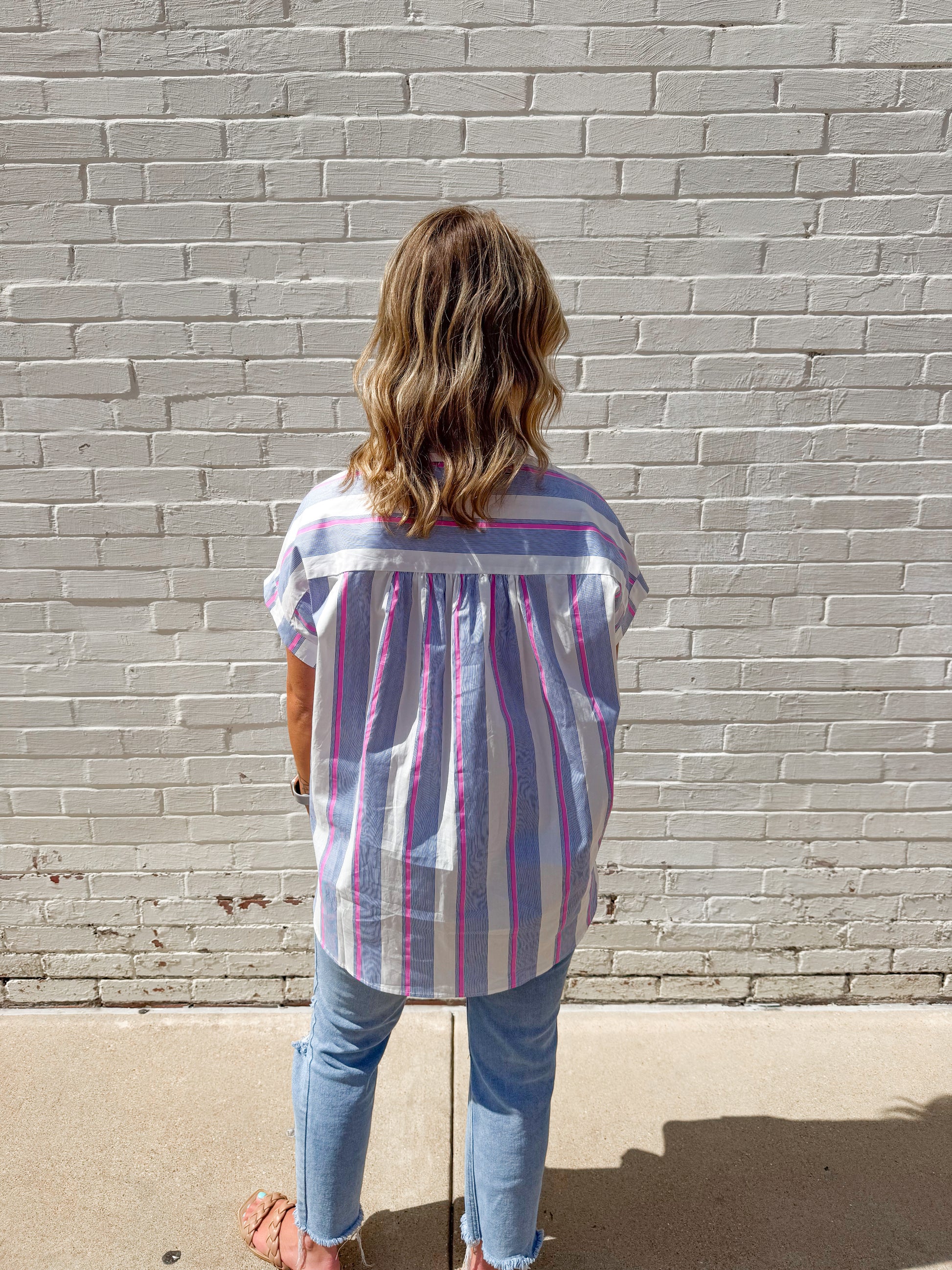 The Kendall Top is all about classic vibes with a fun, modern twist. Featuring bold vertical stripes in blue, pink, and white, this breezy button-up is made for sunny days and effortless style. The relaxed, boxy fit and cuffed short sleeves give it a cool, casual feel—perfect for a front-tuck into denim or worn loose over bike shorts.