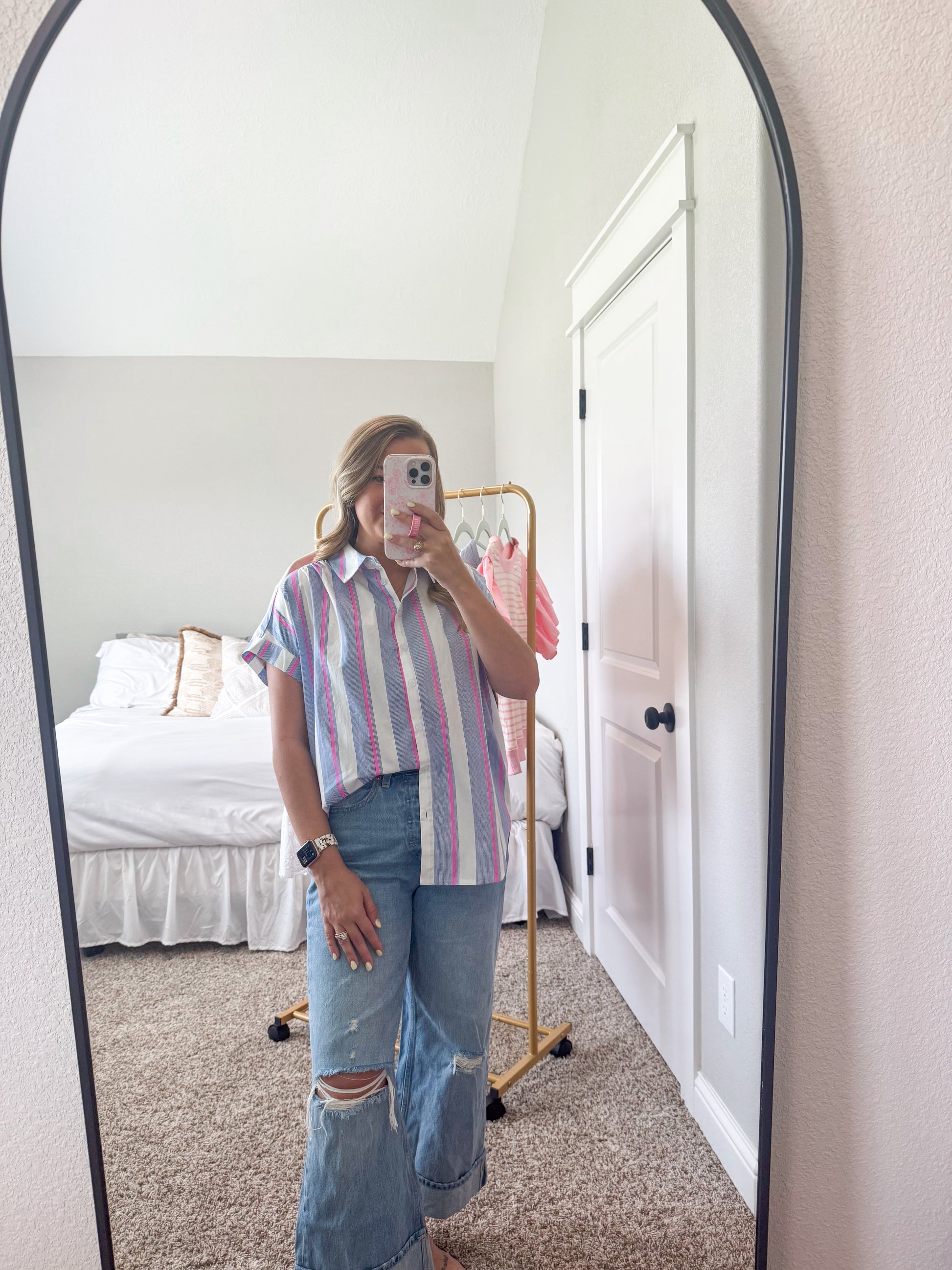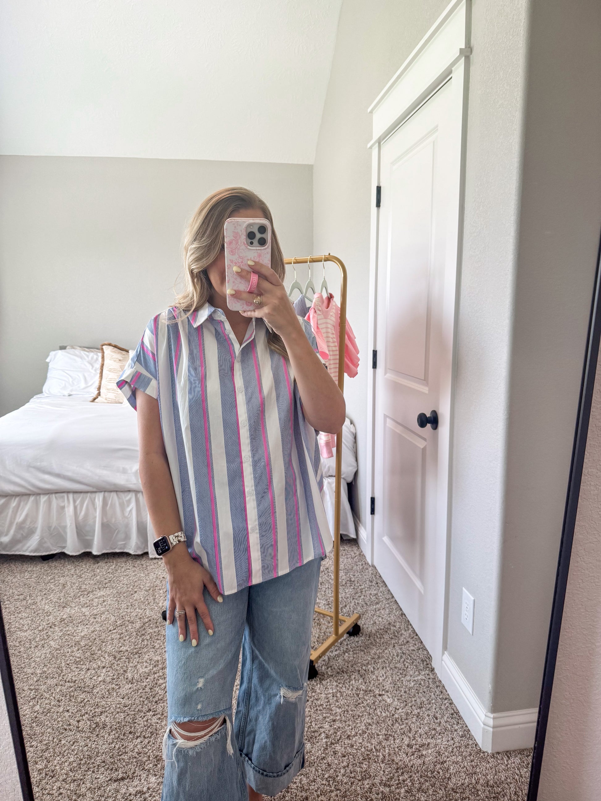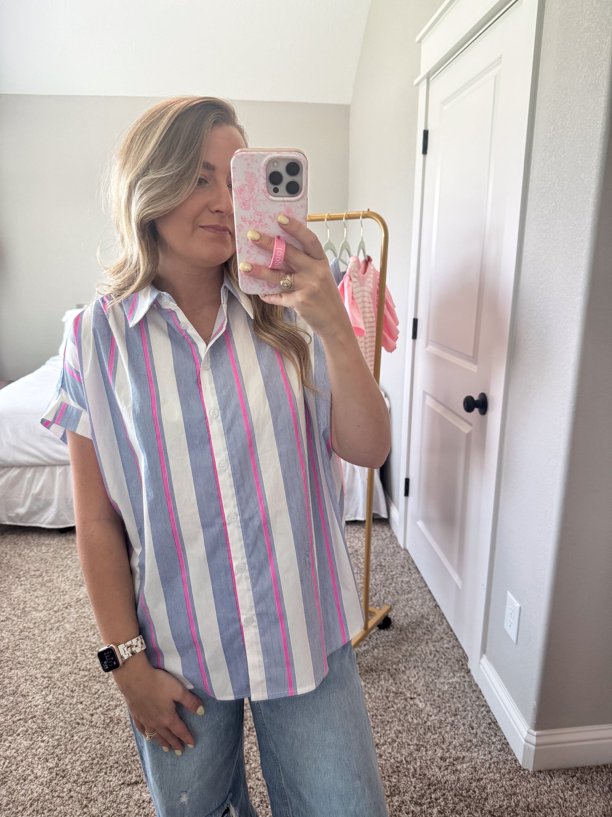 The Kendall Top is all about classic vibes with a fun, modern twist. Featuring bold vertical stripes in blue, pink, and white, this breezy button-up is made for sunny days and effortless style. The relaxed, boxy fit and cuffed short sleeves give it a cool, casual feel—perfect for a front-tuck into denim or worn loose over bike shorts.