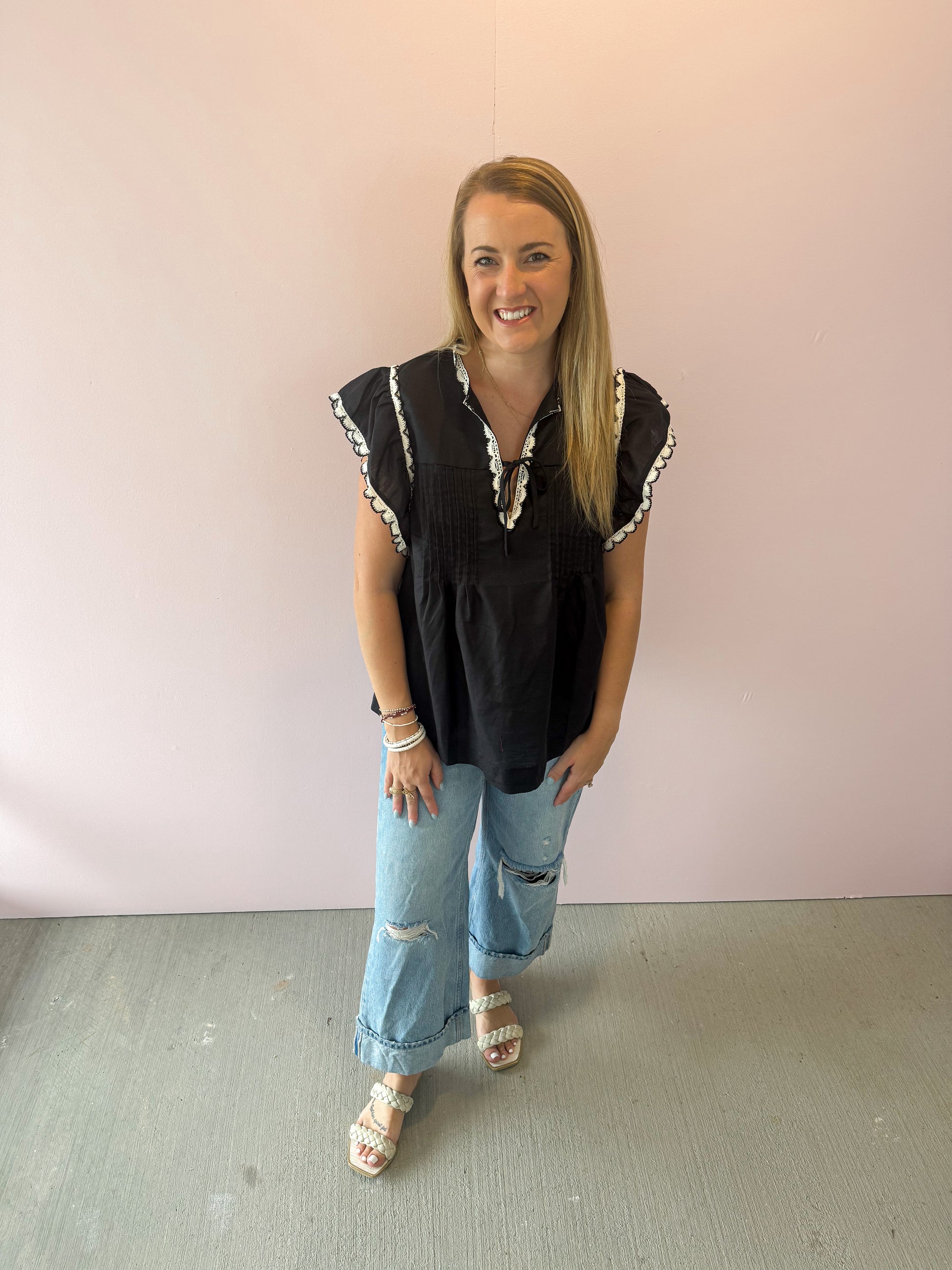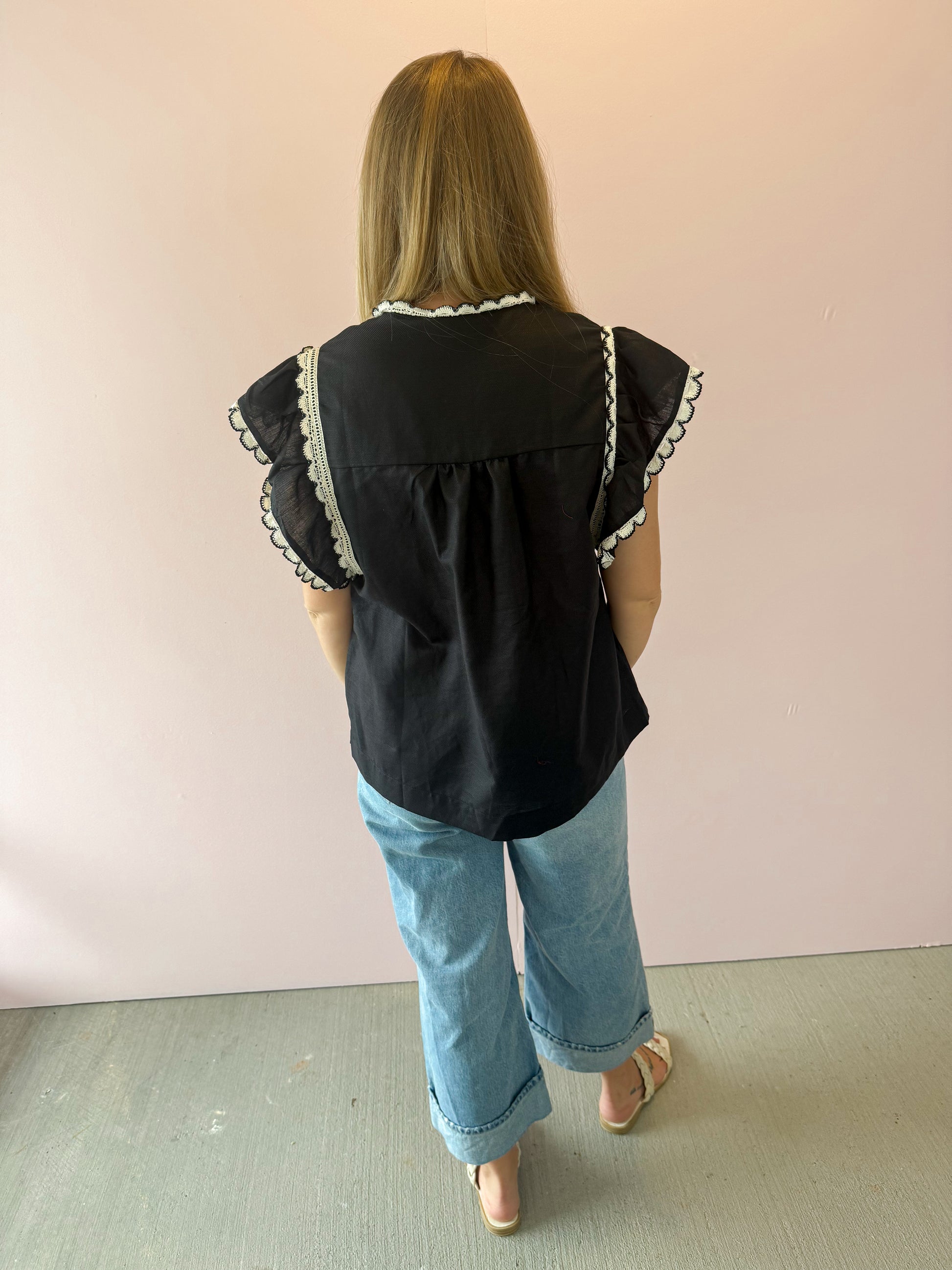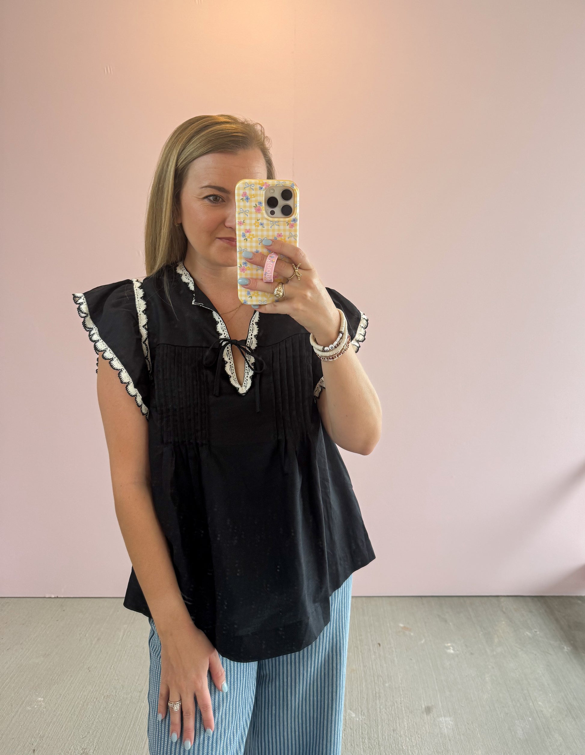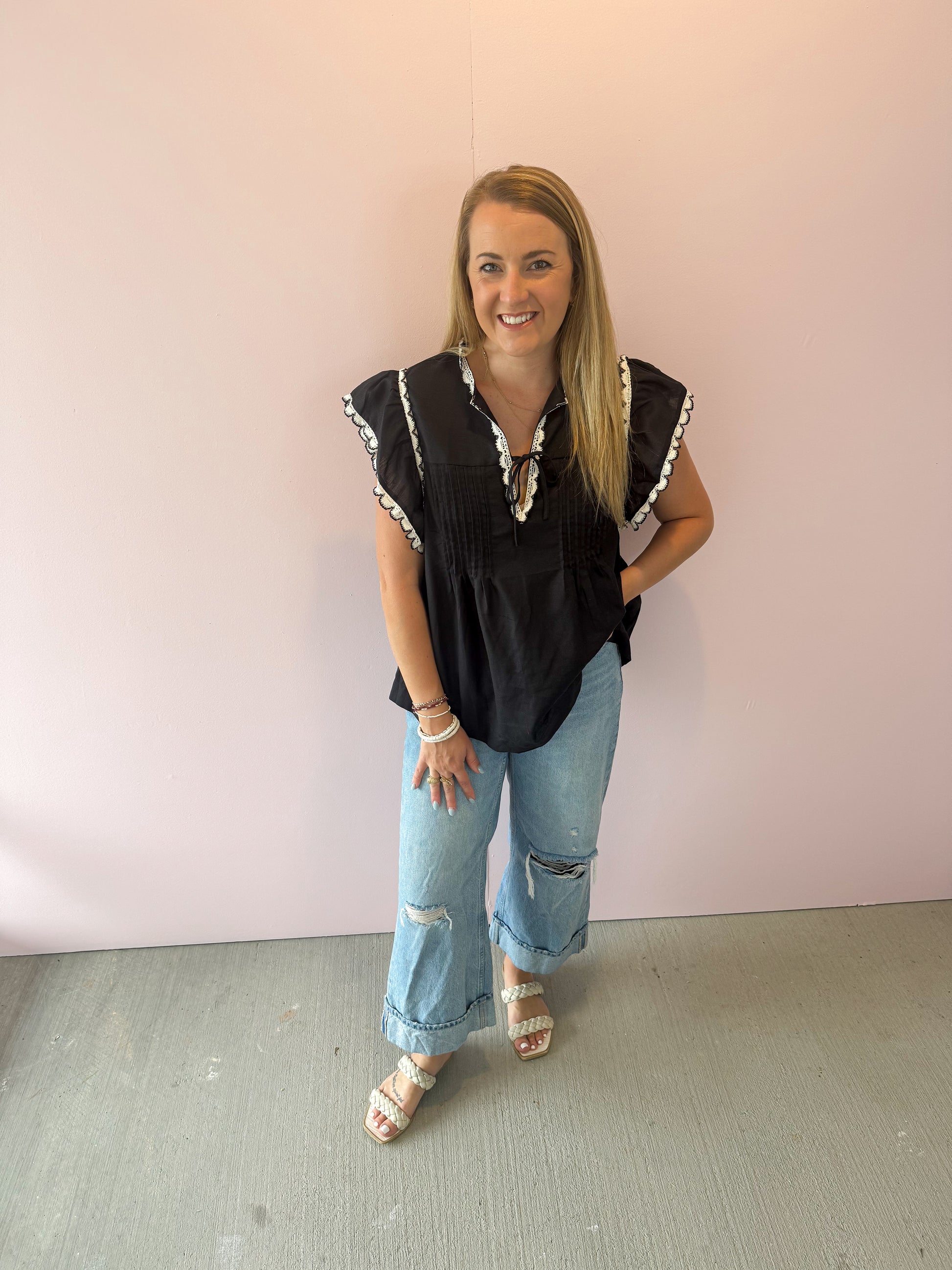 Romantic and effortlessly chic, the Lacey Flutter Top adds the sweetest touch to your everyday style. Featuring ruffled flutter sleeves with delicate lace trim, pintuck detailing, and a tie-front neckline, this lightweight woven top is perfect for both casual days and dressed-up nights. Its relaxed fit makes it comfortable while still giving off that feminine, polished vibe.