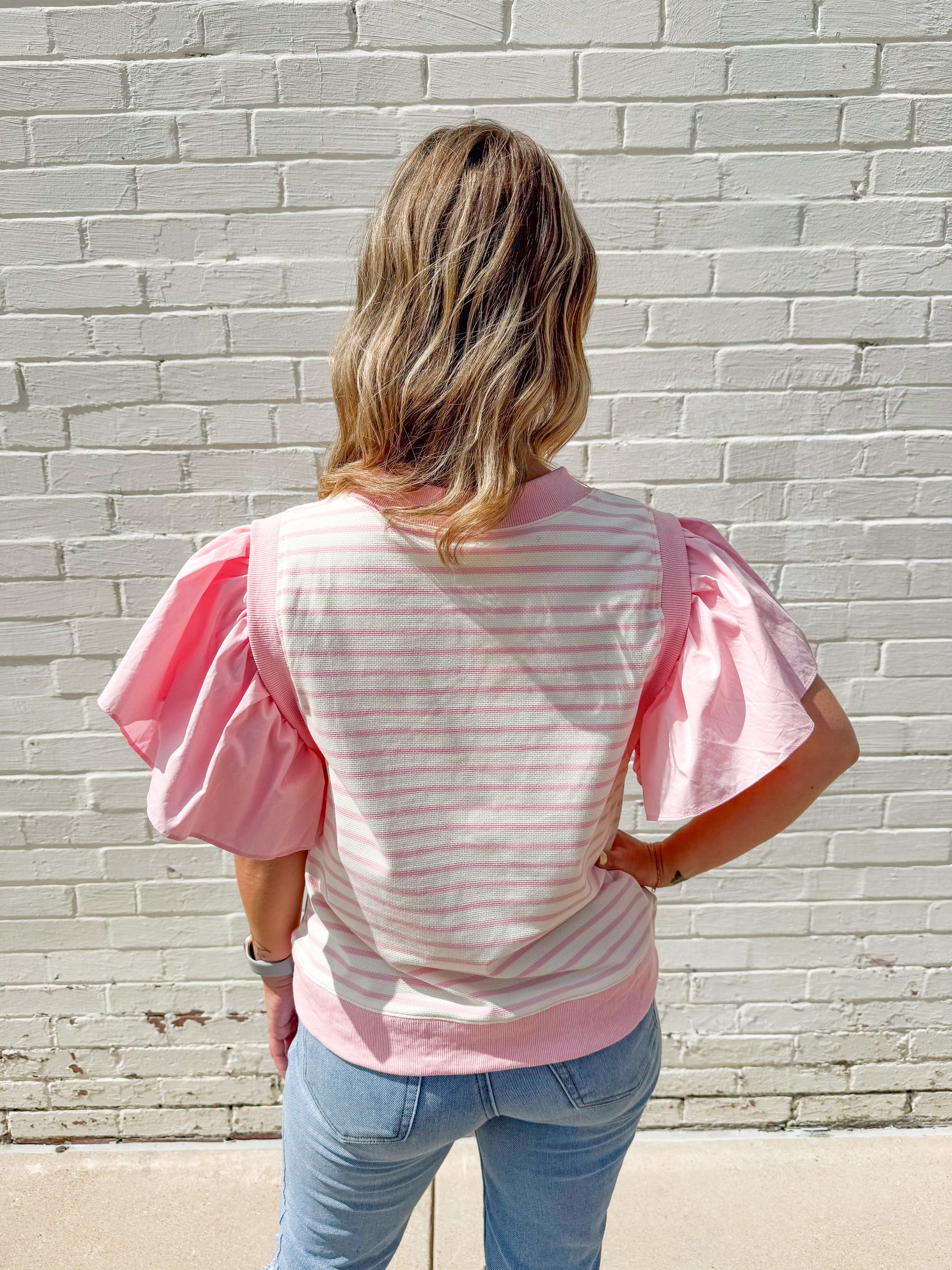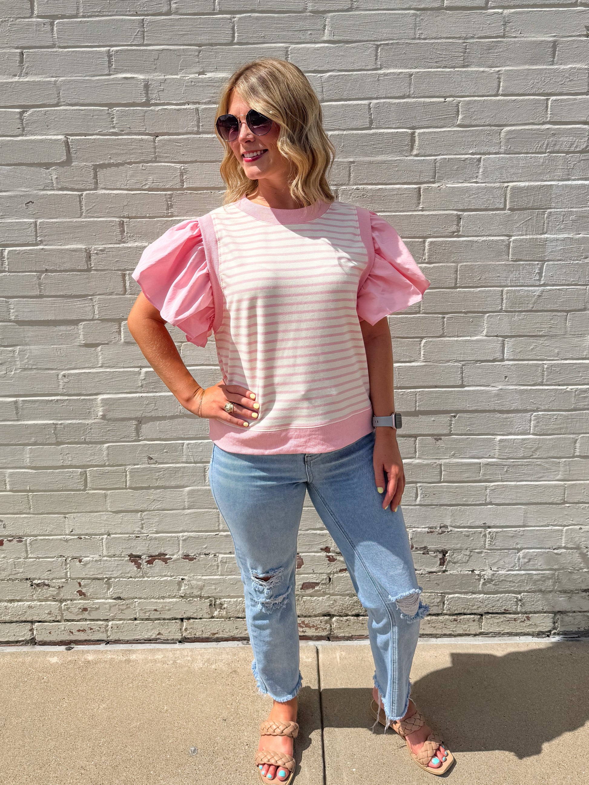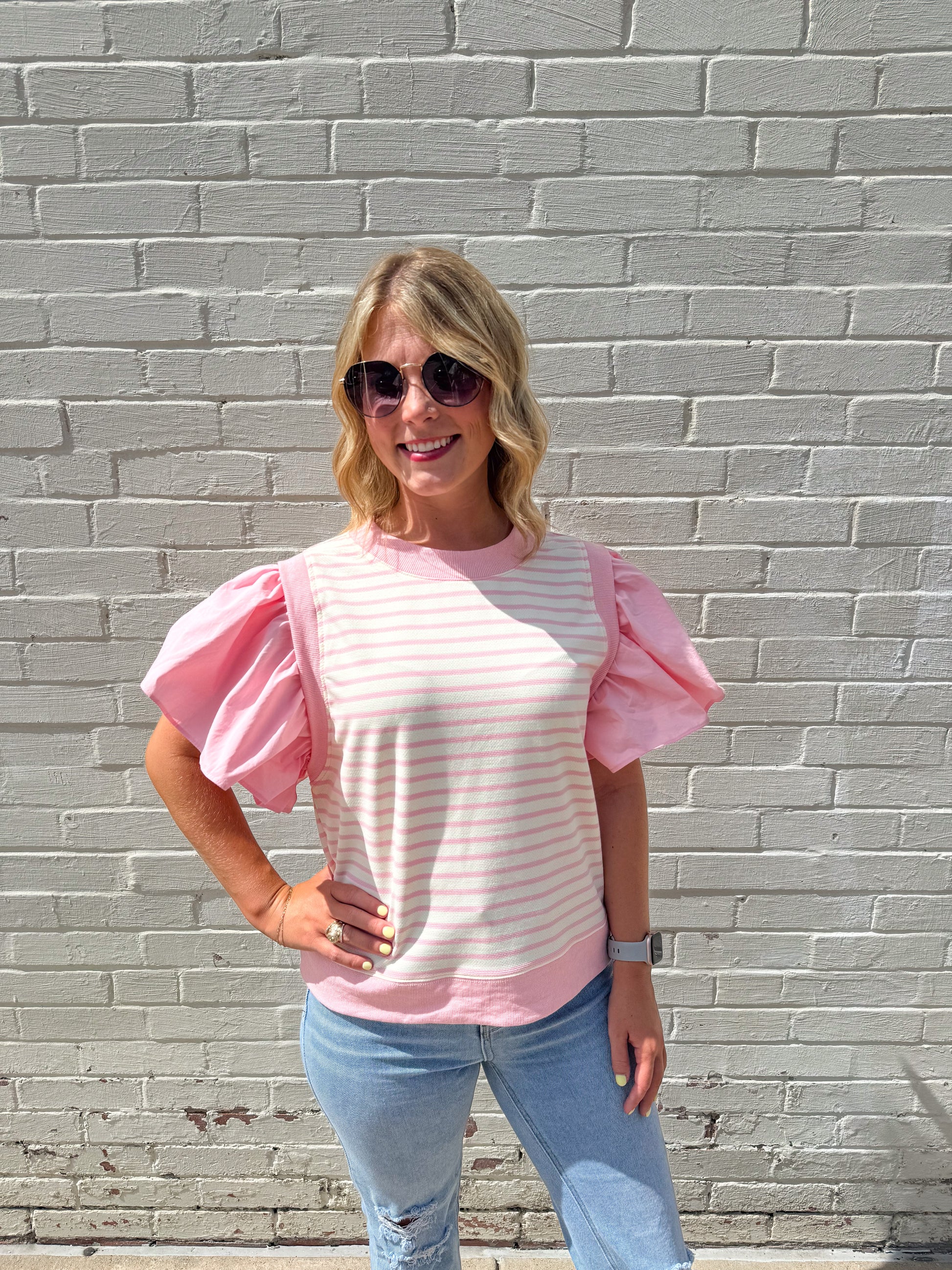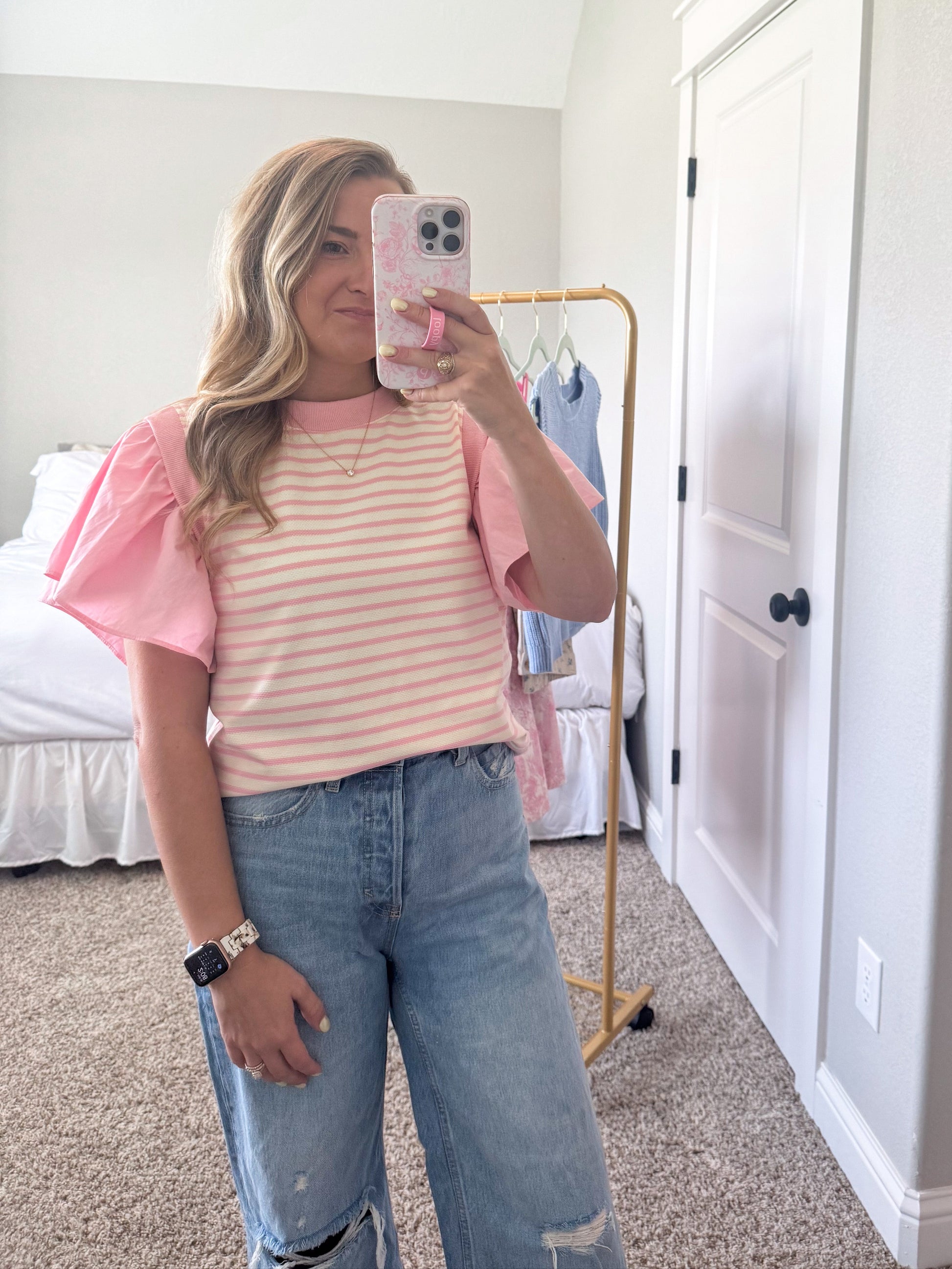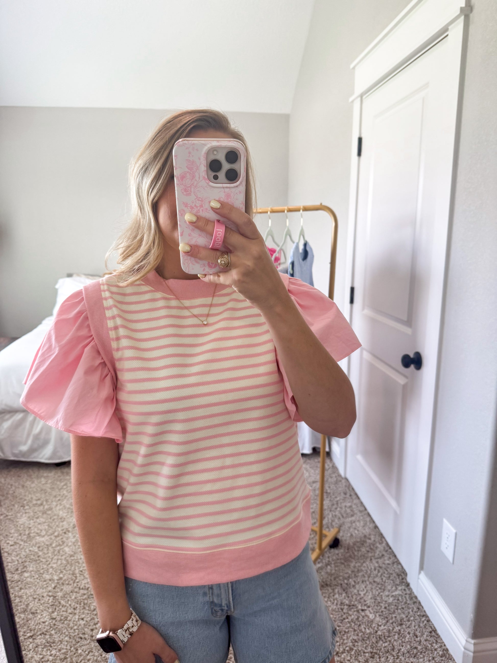 The Lyla Top is where sweet meets statement. With soft pink and cream stripes and dramatic ruffle sleeves, this top adds instant charm to any outfit. The relaxed fit and comfy knit fabric make it an easy pick for brunch, errands, or a casual night out—just add your favorite jeans and go!