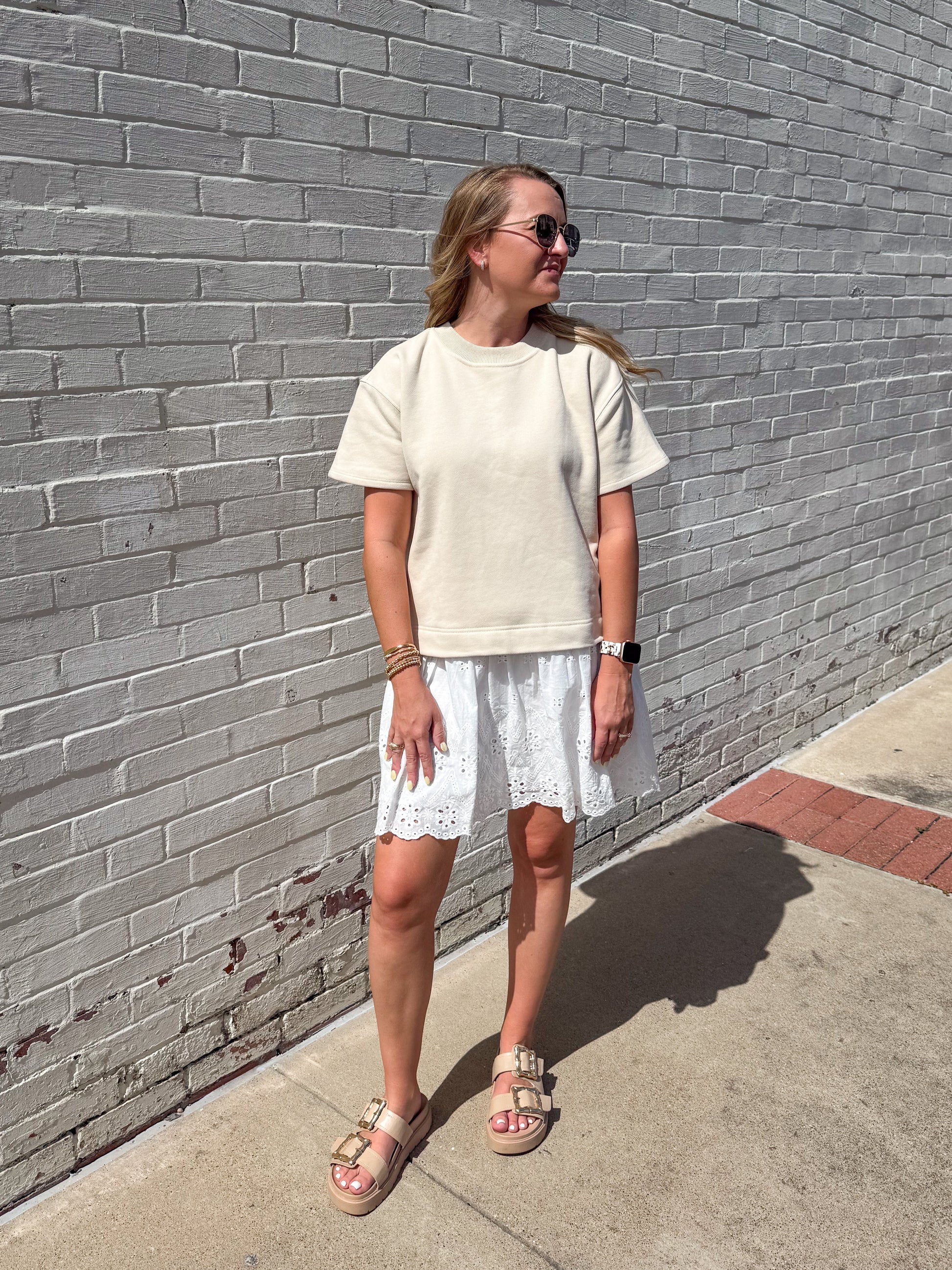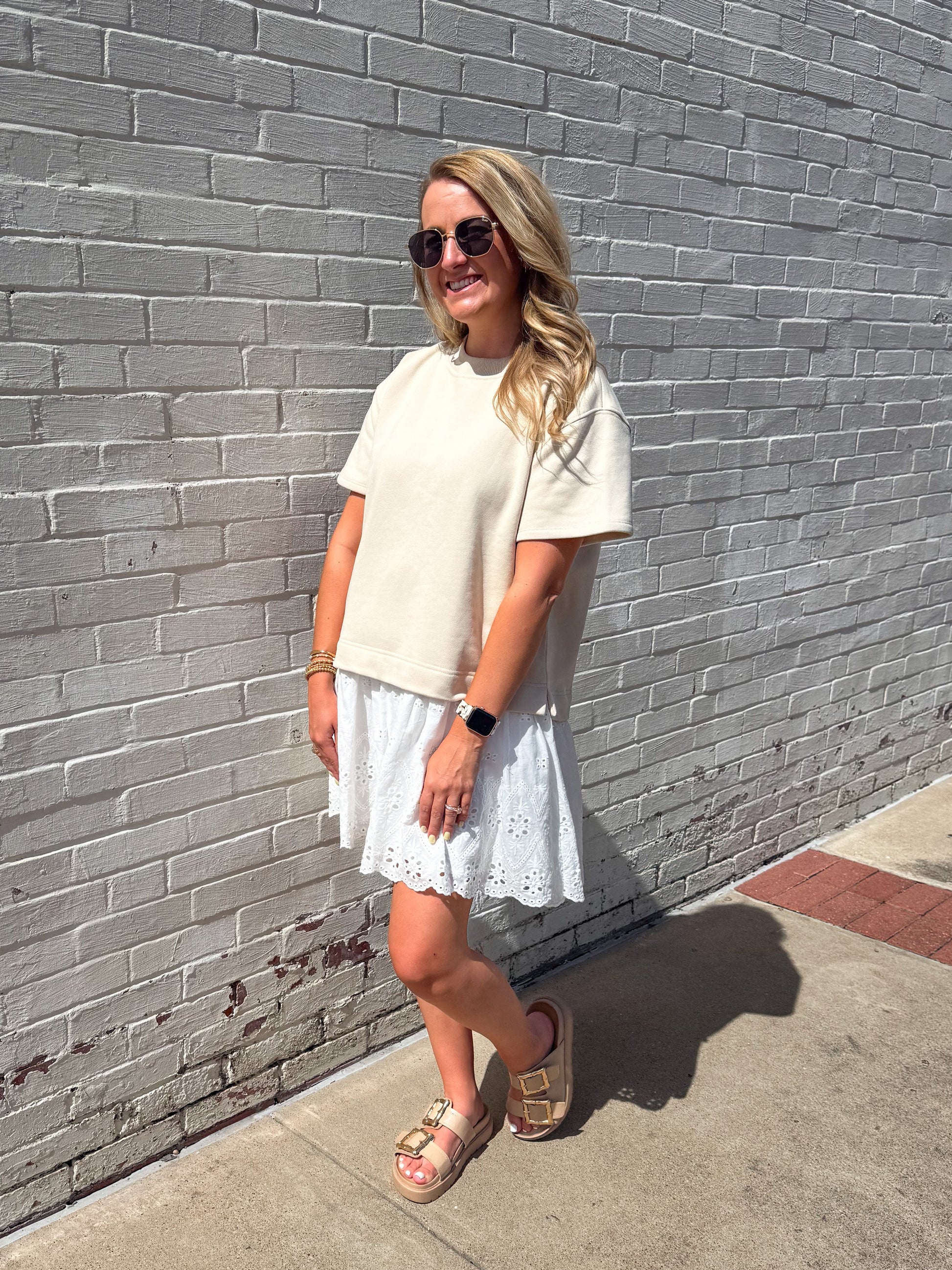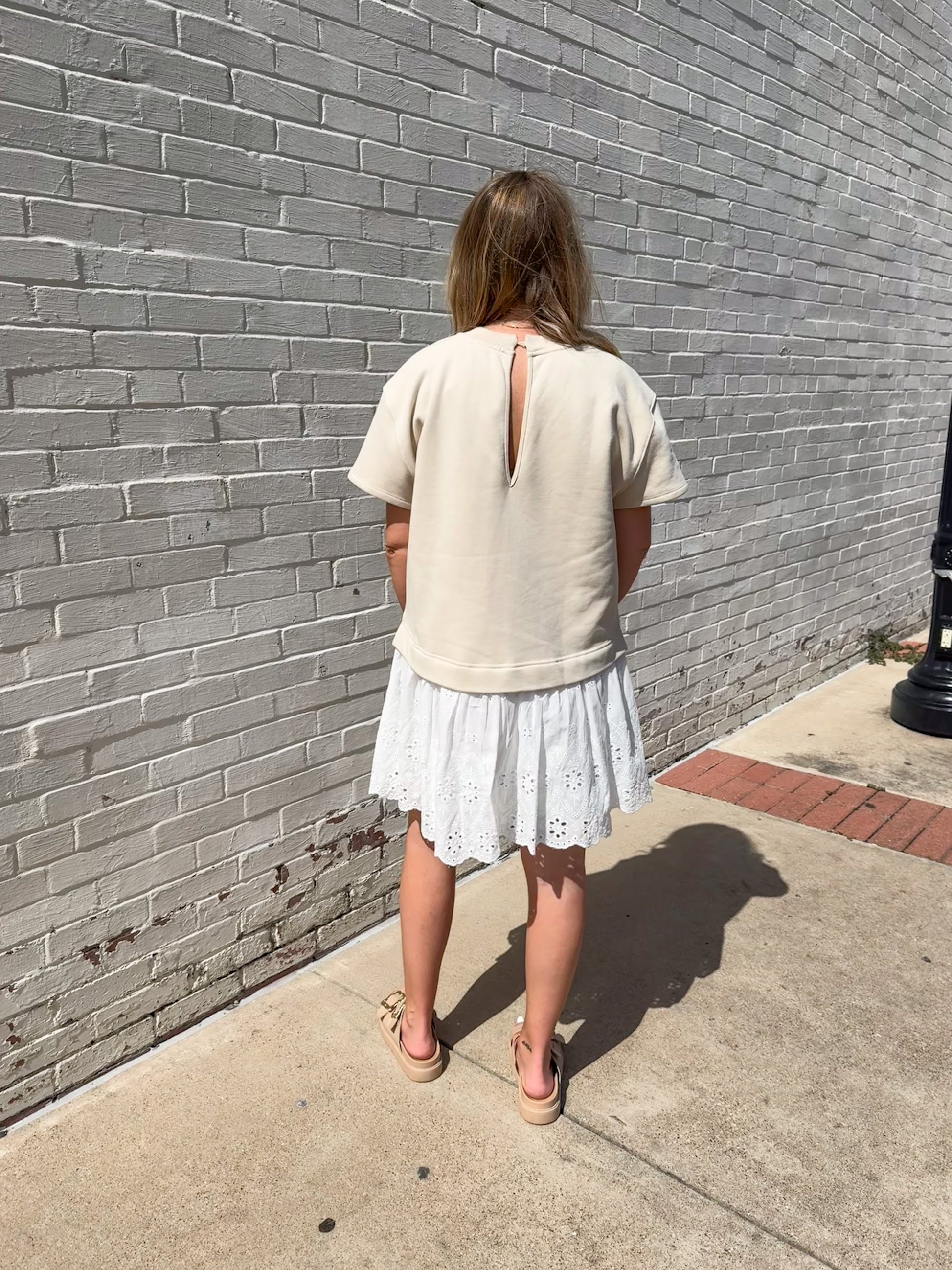 Effortlessly blending comfort and charm, the Micki Romper is your new go-to for easy style. This playful one-piece features a relaxed, oversized beige sweatshirt-style top with short sleeves and a soft crew neckline. The contrast bottom gives the illusion of a layered look, showcasing a crisp white skirt with delicate eyelet embroidery and scalloped edges for a feminine finish. Whether you’re heading to brunch or a weekend outing, the Micki Romper makes getting dressed a breeze—just add sneakers or sandals and go!