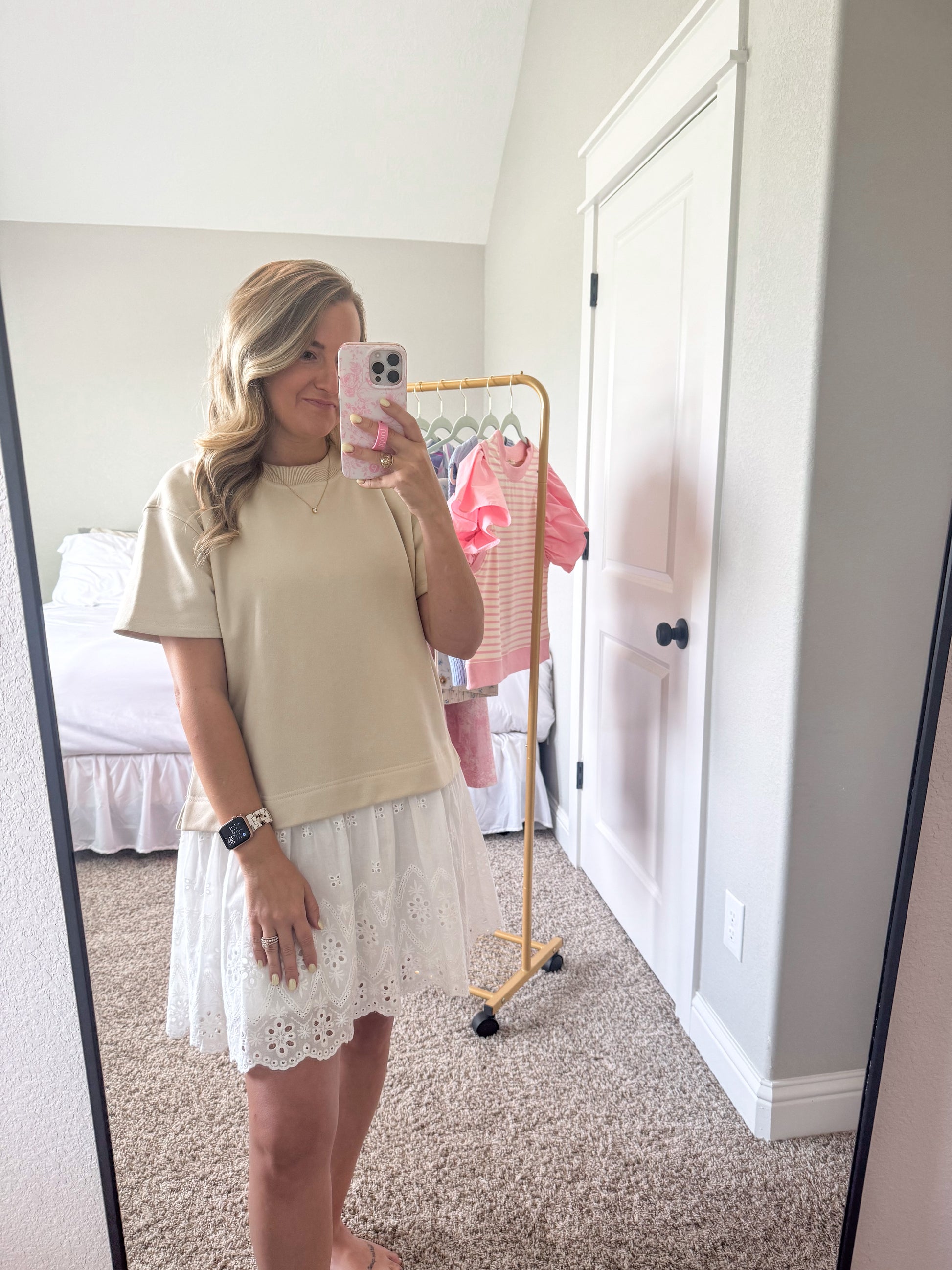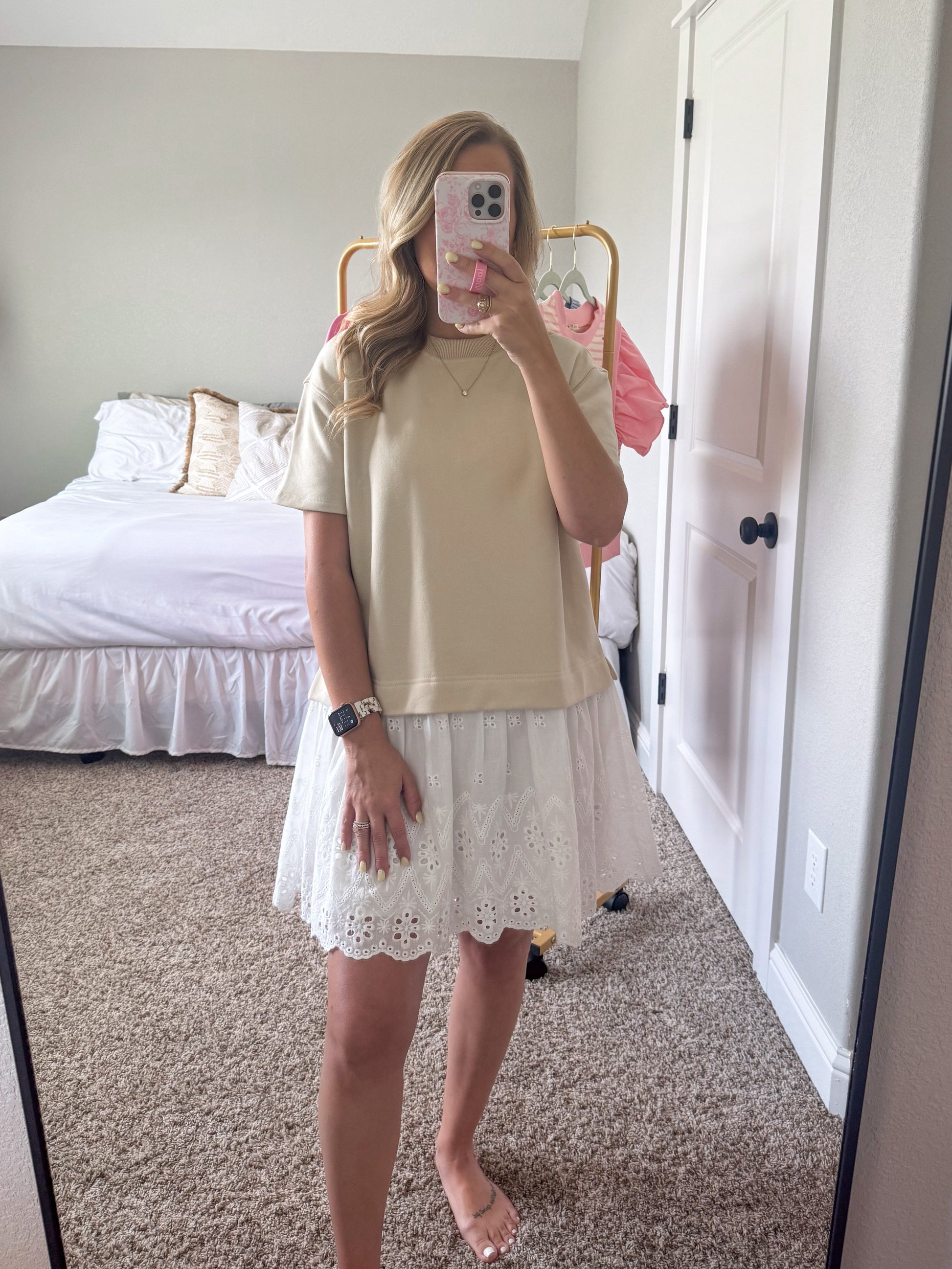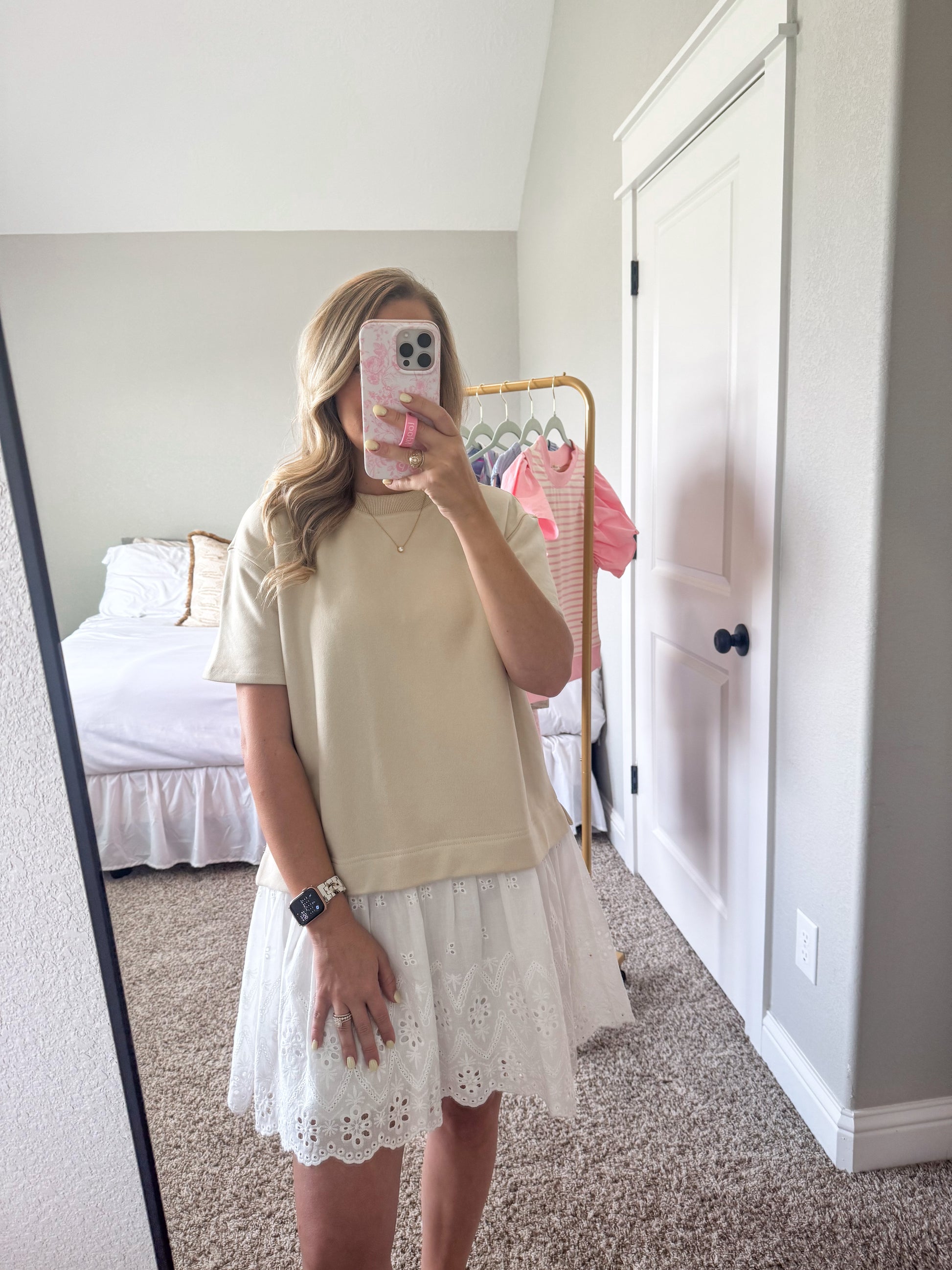 Effortlessly blending comfort and charm, the Micki Romper is your new go-to for easy style. This playful one-piece features a relaxed, oversized beige sweatshirt-style top with short sleeves and a soft crew neckline. The contrast bottom gives the illusion of a layered look, showcasing a crisp white skirt with delicate eyelet embroidery and scalloped edges for a feminine finish. Whether you’re heading to brunch or a weekend outing, the Micki Romper makes getting dressed a breeze—just add sneakers or sandals and go!