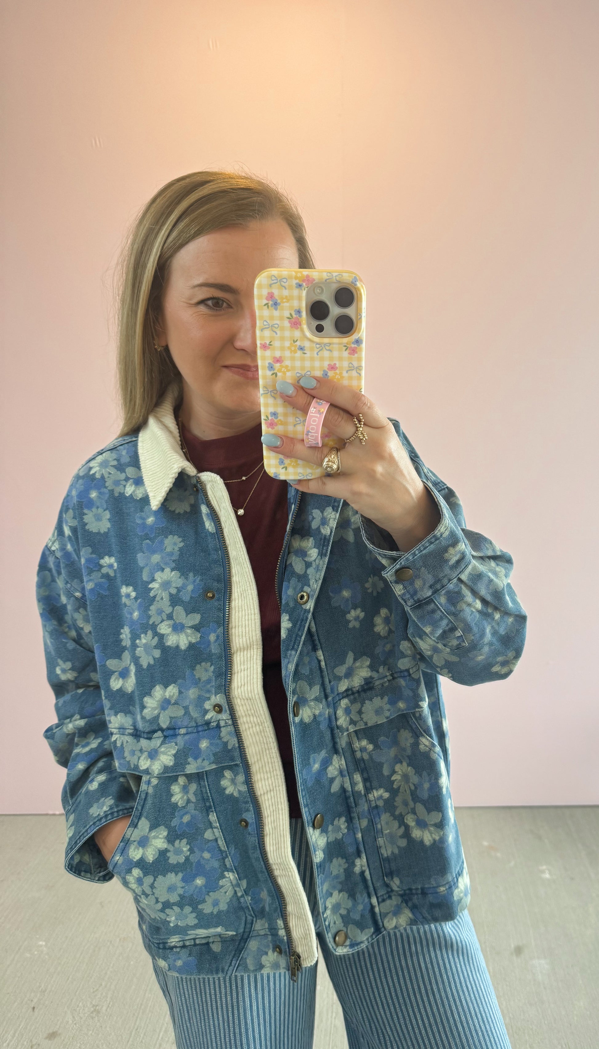 A denim classic with a feminine twist. This floral print jacket features a cozy corduroy contrast collar, snap button + zipper closure, and functional pockets for everyday wear. Lightweight yet sturdy, it’s the perfect layering piece to carry you through every season with a touch of charm.