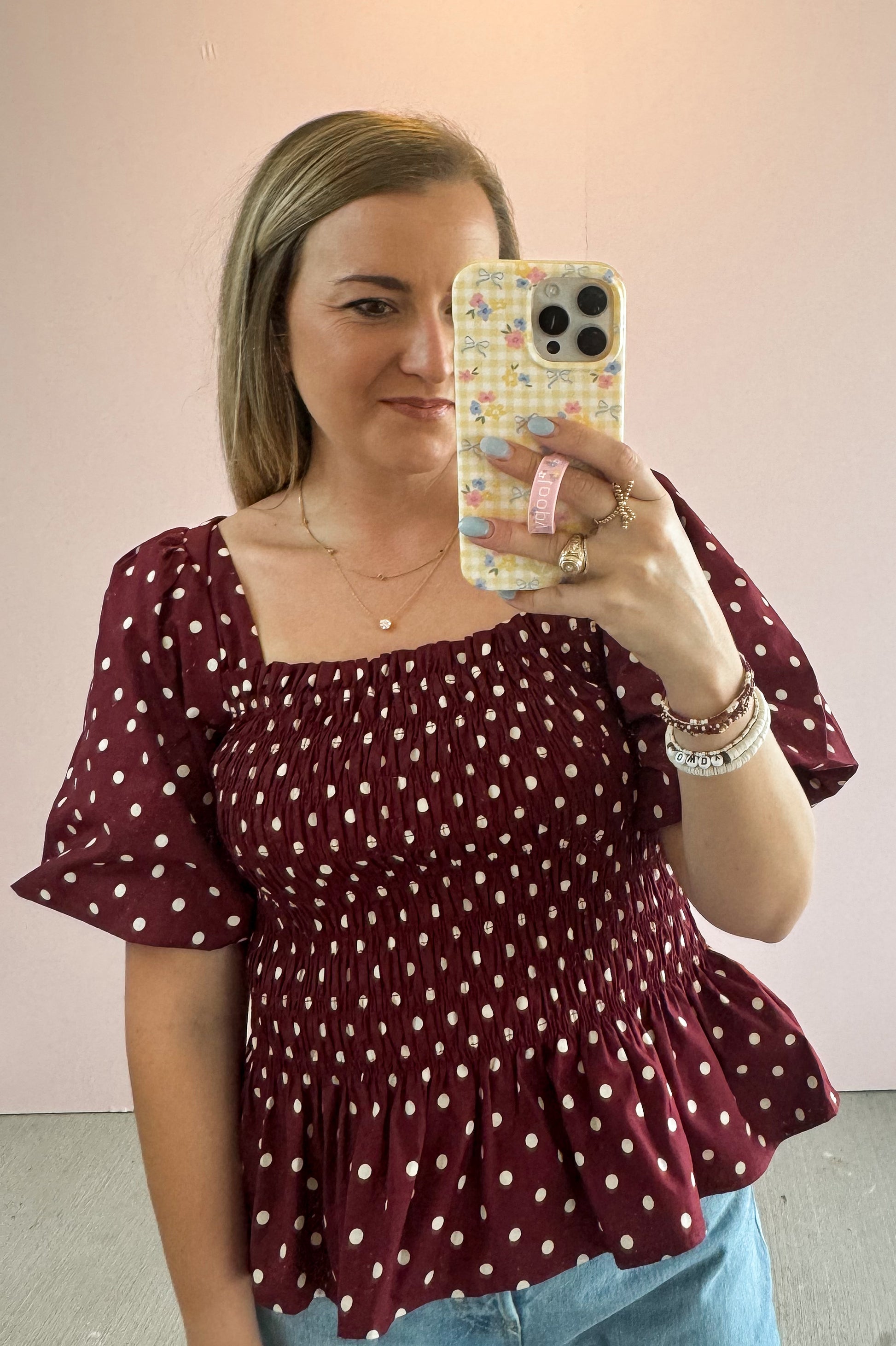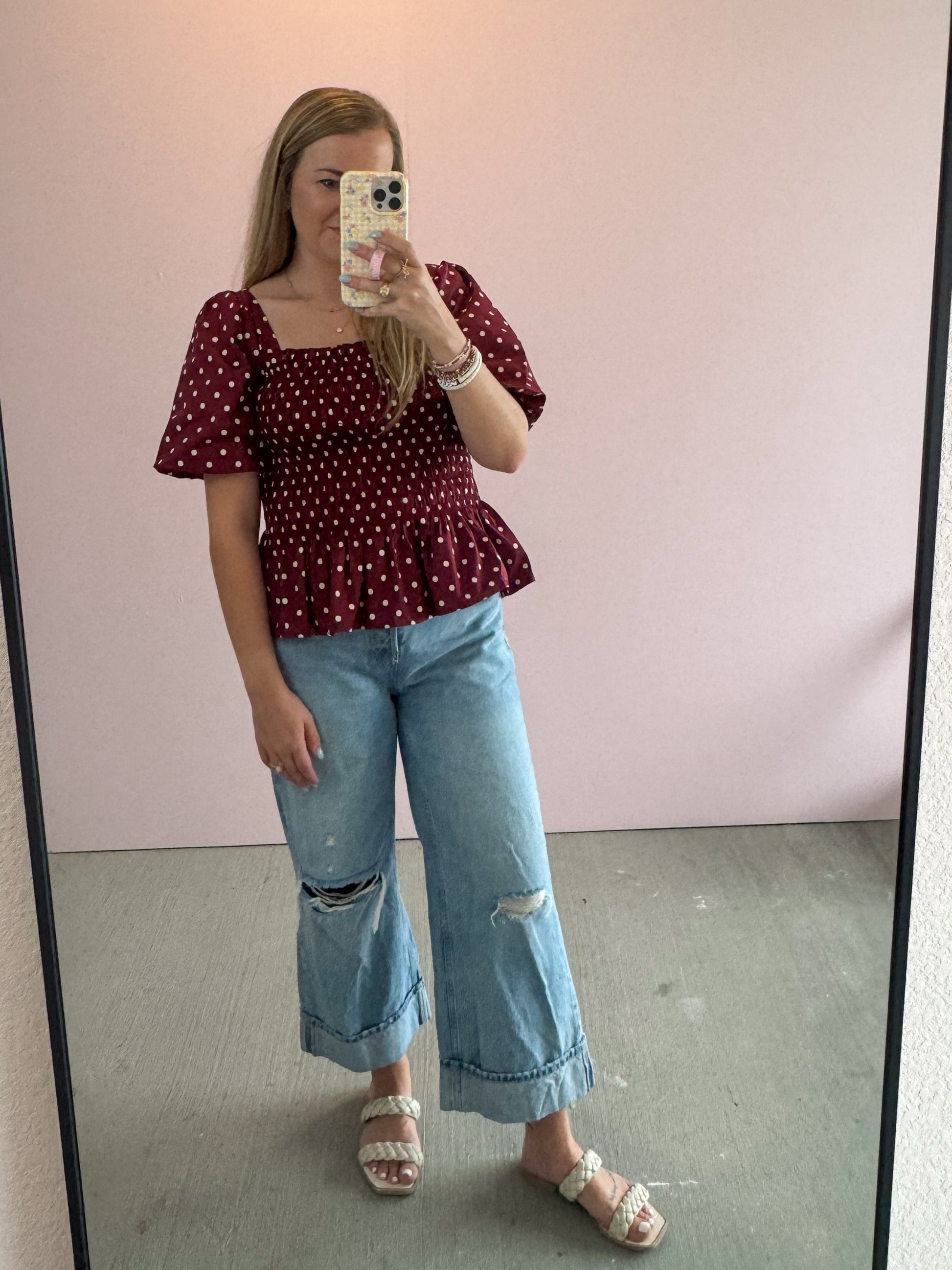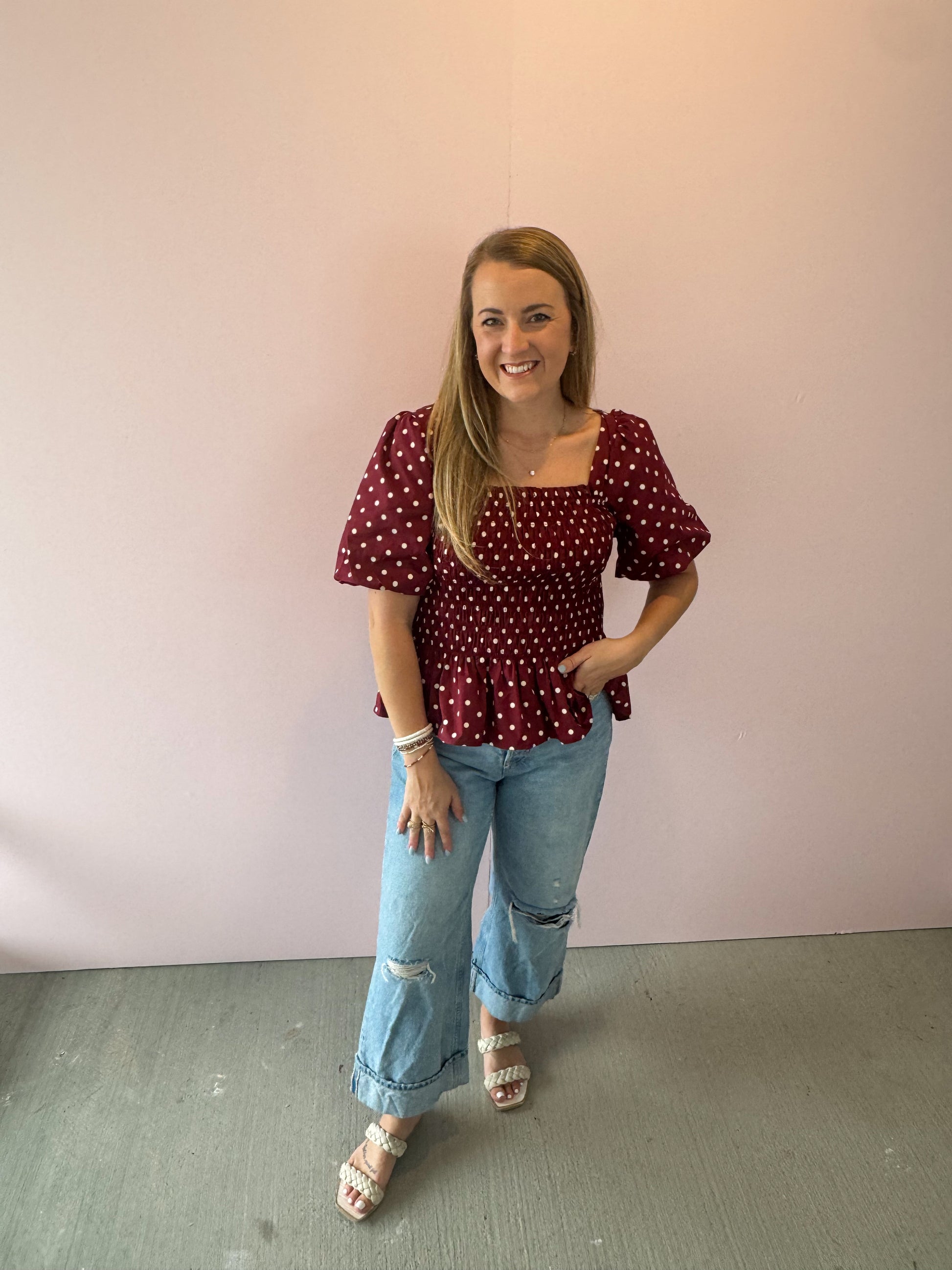 Timeless polka dots meet a flattering smocked silhouette in this chic burgundy blouse. The square neckline and puff sleeves bring a touch of romance, while the stretchy smocked bodice ensures a comfortable, curve-hugging fit. Finished with a playful peplum hem, it’s the perfect mix of feminine and fun.
