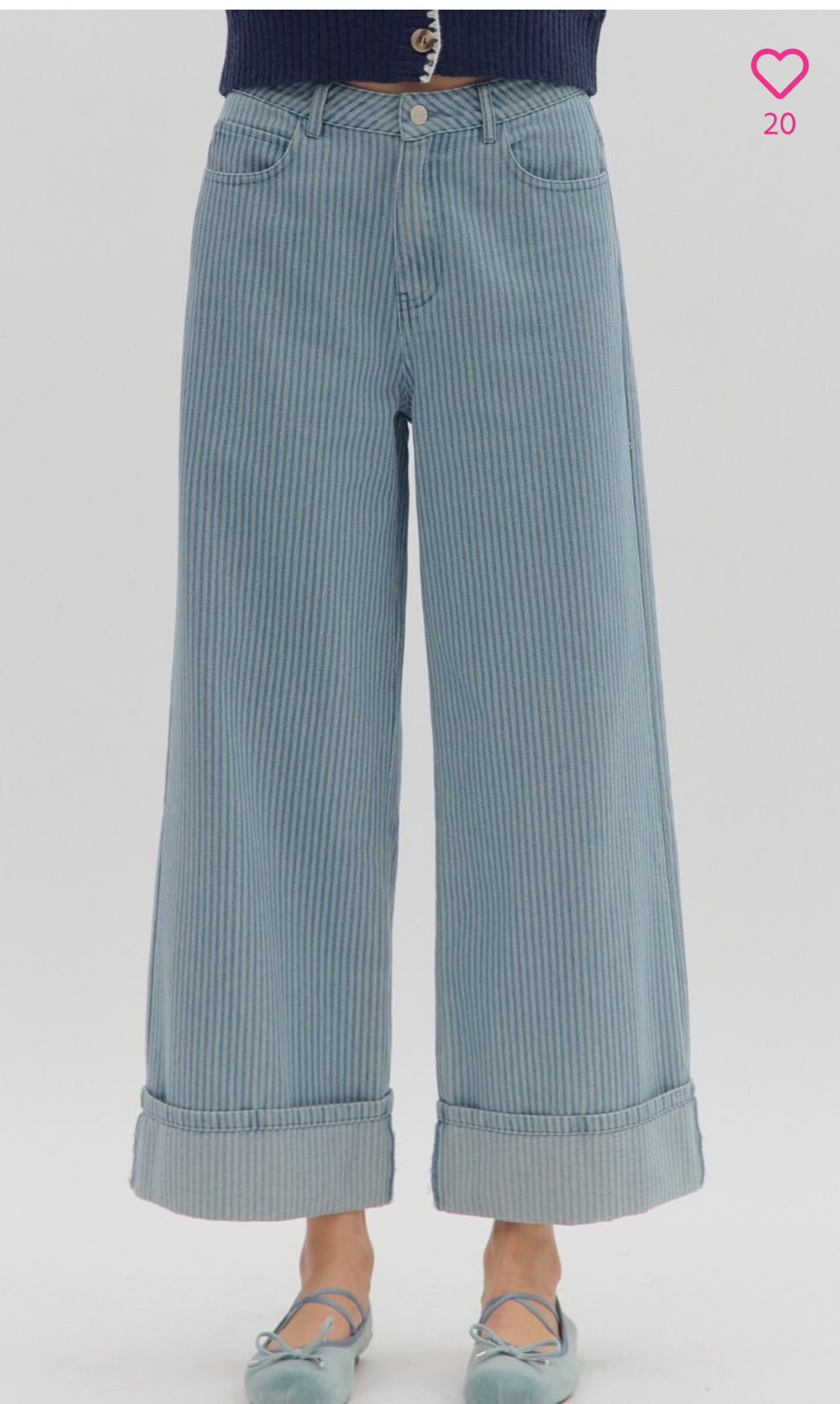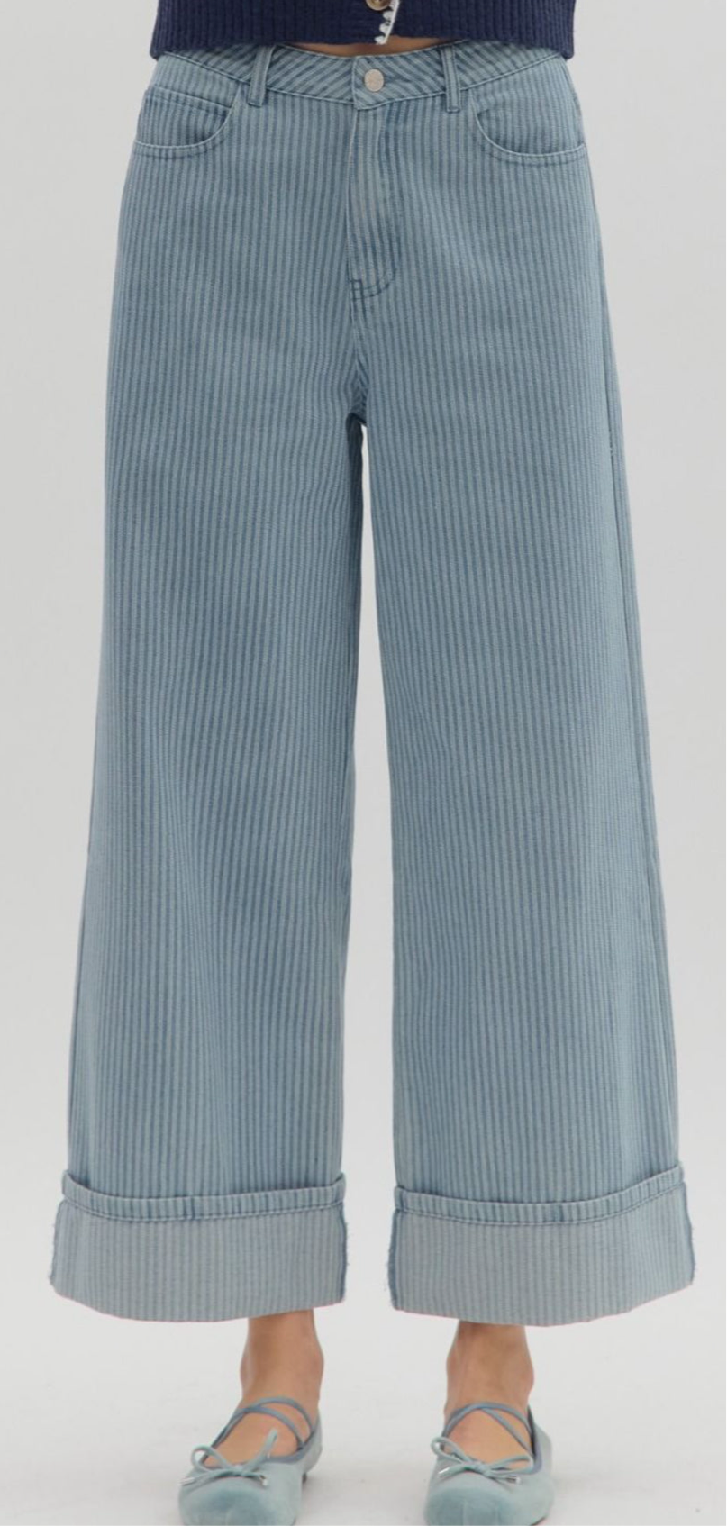 A fresh take on denim, these striped ankle-length pants feature a flattering mid-rise fit, wide-leg silhouette, and statement cuffed hem. Lightweight yet structured, they’re perfect for pairing with tucked-in blouses or cropped knits. Add your favorite sneakers or ballet flats for an effortlessly chic look.