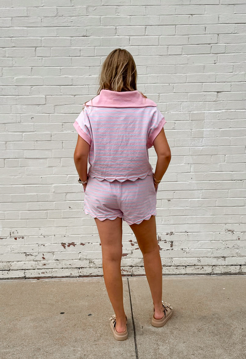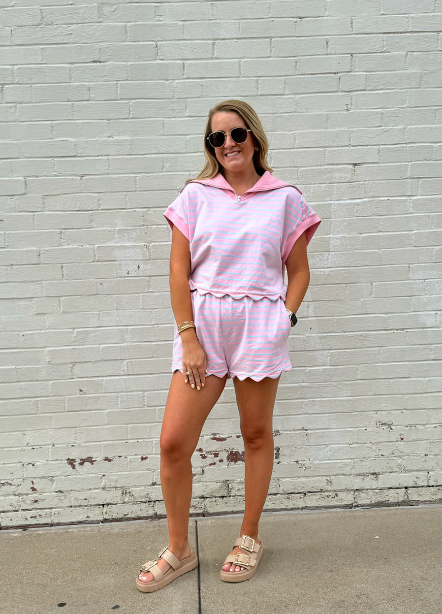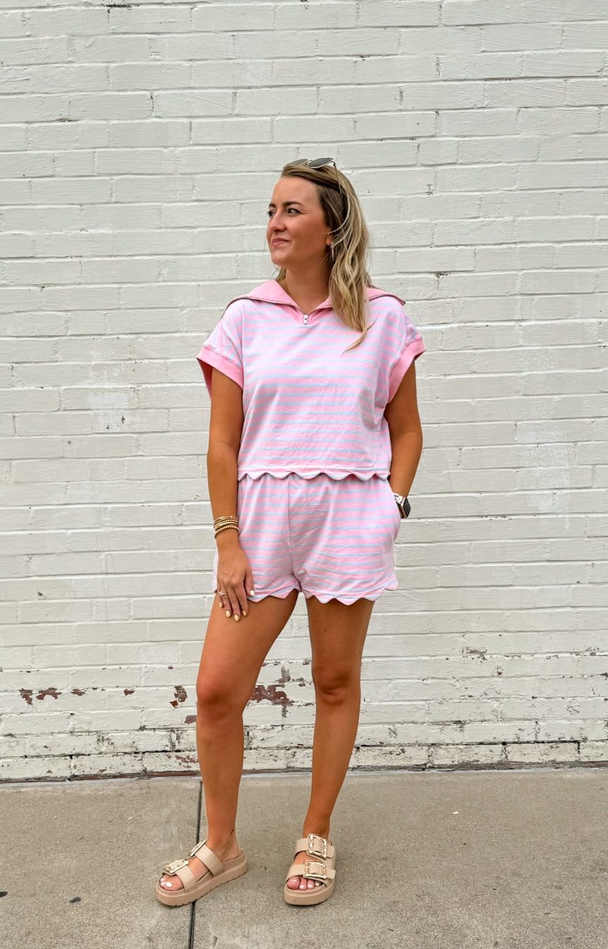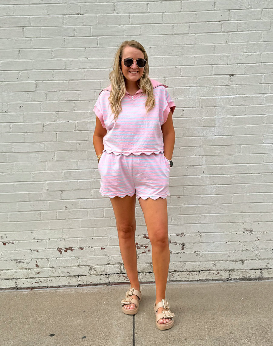 Elevate your casual style with our Savannah Striped Set! This playful combo features a French Terry scallop hem top with dolman sleeves and a collared neckline with convenient front zipper. The matching shorts come with pockets for functionality. You can also mix and match these pieces for multiple outfit options! A perfect versatile outfit!