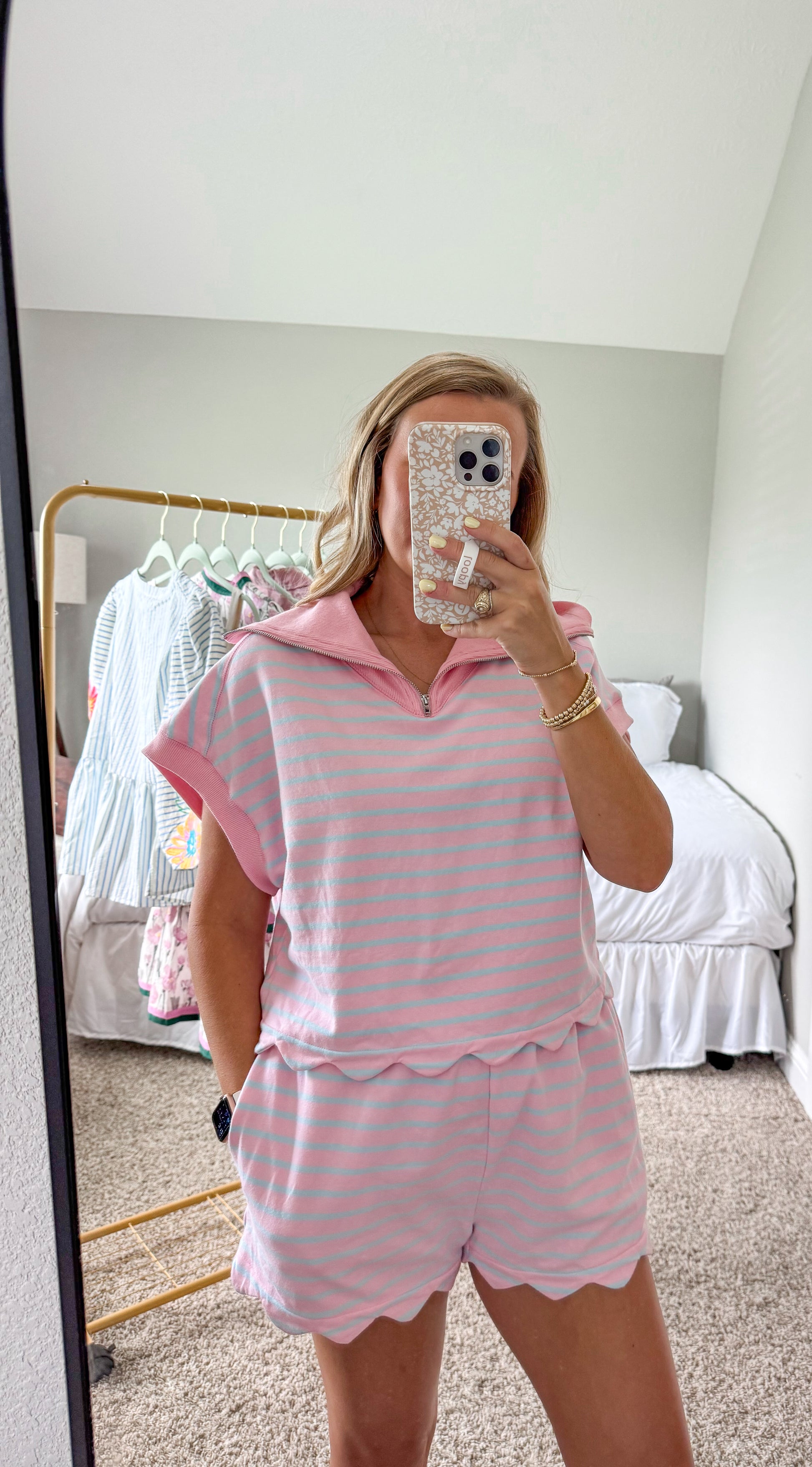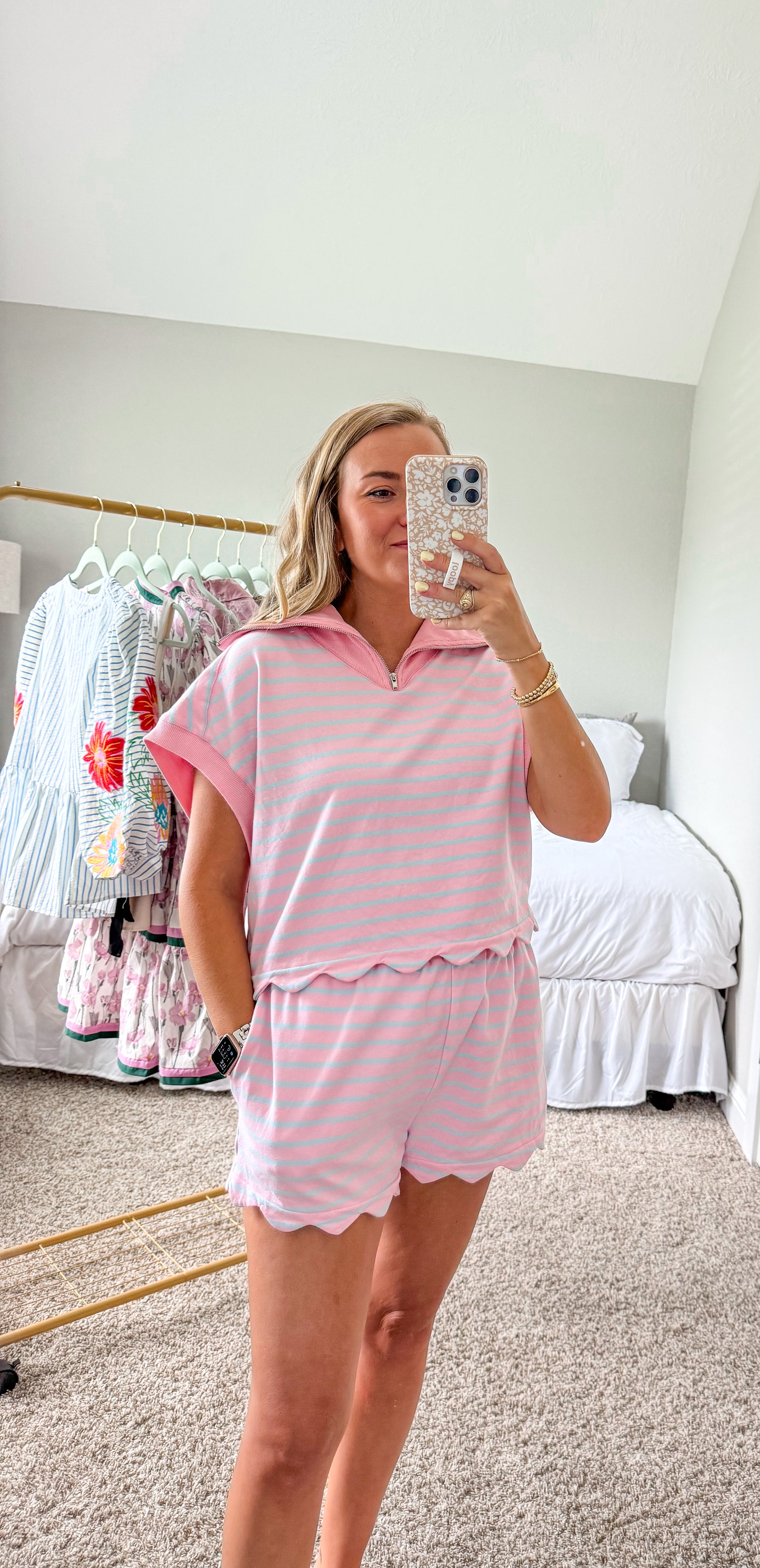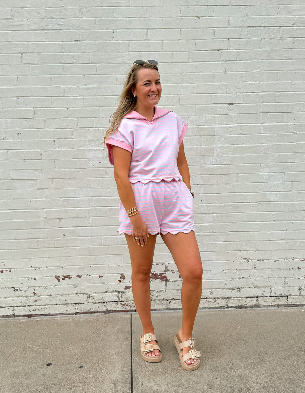 Elevate your casual style with our Savannah Striped Set! This playful combo features a French Terry scallop hem top with dolman sleeves and a collared neckline with convenient front zipper. The matching shorts come with pockets for functionality. You can also mix and match these pieces for multiple outfit options! A perfect versatile outfit!